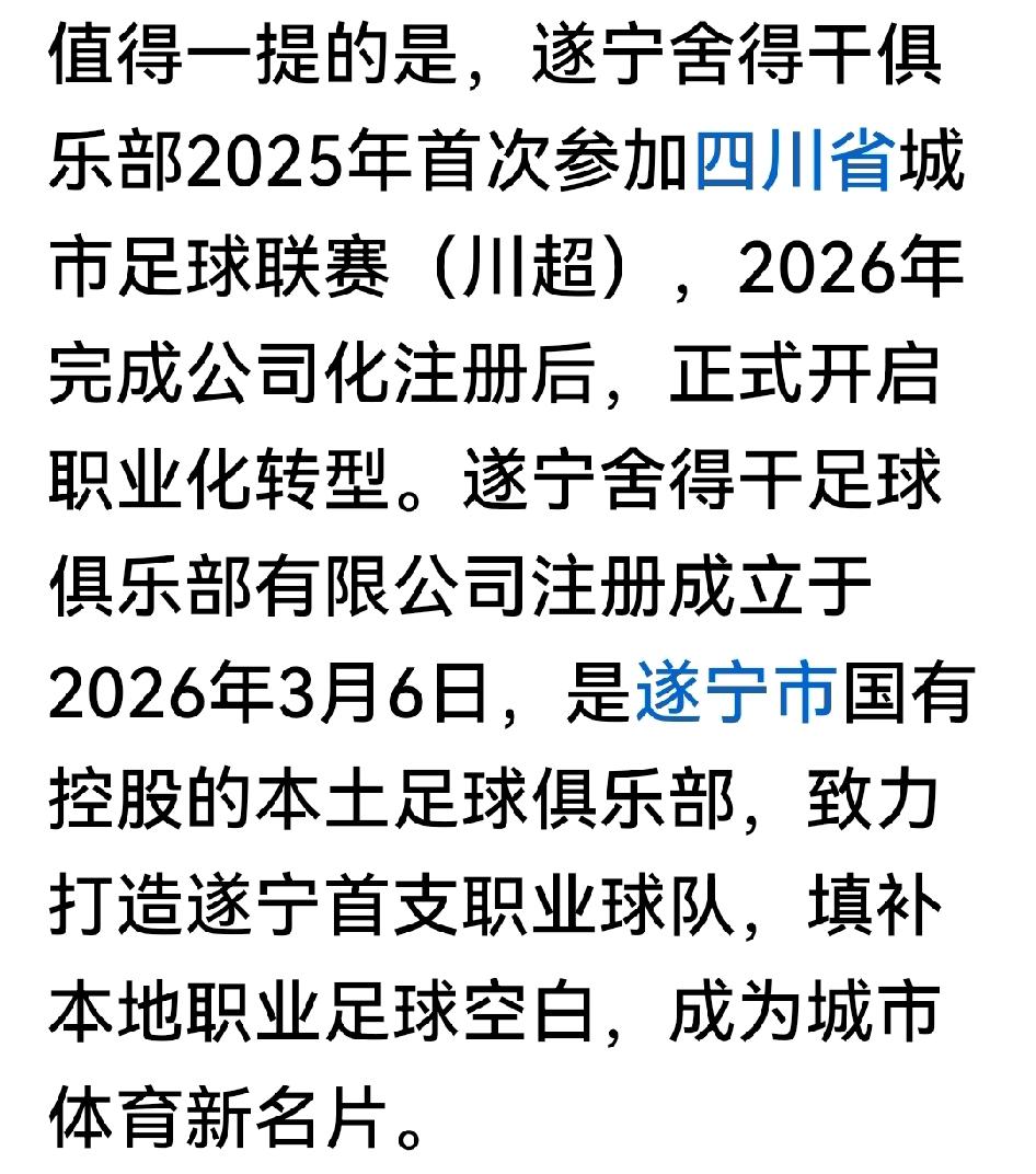 遂宁地处川中腹地,知名的大企业只记得“舍得”酒业。记忆中,中甲的四川九牛(现深圳新鹏城)在遂宁打主场时,也有超高的人气,这也许才是遂宁发展职业足球的底气。但足球是烧钱运动,不知道这舍得干足球最终能走多远呢?
