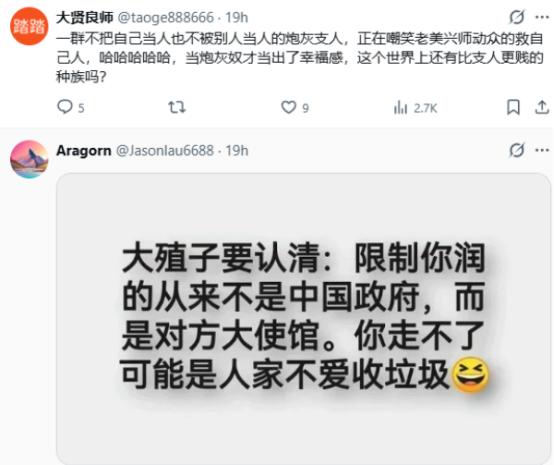 可他不知道的是,他这番话发出去,没等来其他殖子的附和,反而被外网的网友泼了一盆冷水,连一些常年待在美国的华人,都忍不住出来反驳他。