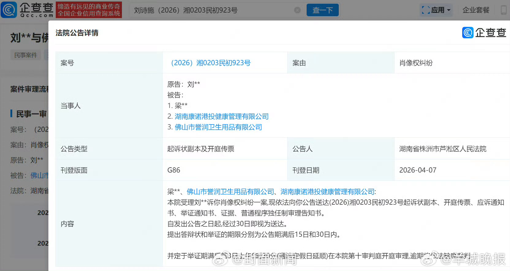 【#刘诗诗诉多方侵权#】#刘诗诗起诉卫生巾公司侵权#企查查APP显示,近日,法院依法向梁某、佛山市誉润卫生用品有限公司、湖南康诺港投健康管理有限公司公告送达起诉状副本、开庭传票、应诉通知书等,涉刘诗施(刘诗诗)与其肖像权纠纷一案。自发出公告之日起,经过30日即视为送达。提出答辩状和举证的期限分别为公告期满后15日和30日内,并定于举证期满后第3日上午9时30分在湖南省株洲市芦淞区人民法院开庭审理。公开信息显示,誉润卫生用品主营卫生巾、安睡裤等产品,拥有多项卫生巾相关专利。更多消息>>#虞书欣工作室 审美##瞿颖 肉毒起作用了##周杰伦 江语晨##浪姐一公小考取消直播##虞书欣和Jennie同款发型#(封面新闻)(编辑:张子皓;审签:周乐瑞)