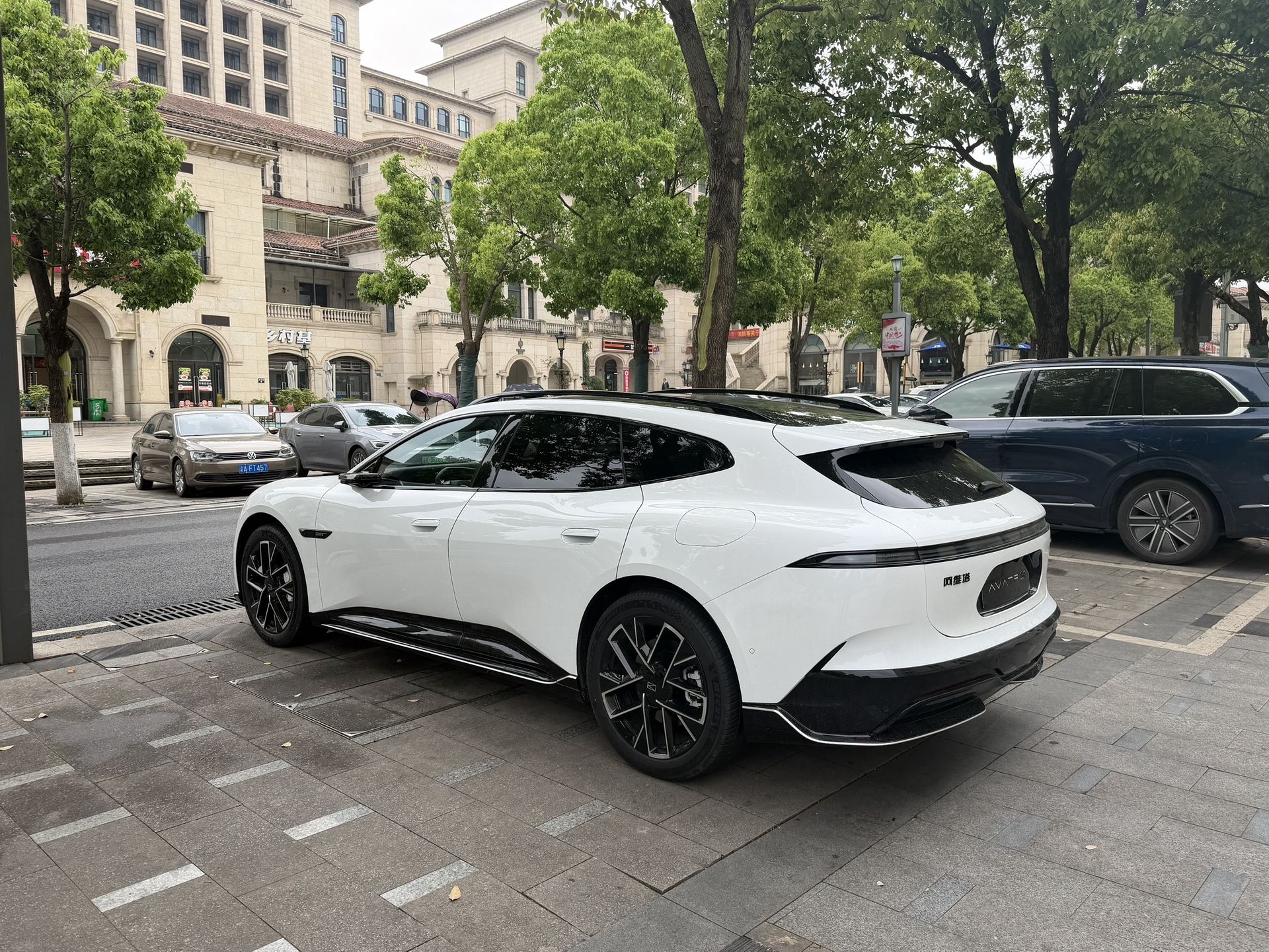 这几年新能源猎装车越来越火,极氪007GT就是代表之一。现在阿维塔也出手了,这台06T就是它的应战车型。据店里工作人员说,新车会在4月8号正式开启预售,我们提前来看看实车。 先说外观。前脸还是阿维塔家族那个辨识度很高的造型,F形飞翼大灯加发光车标,底部有主动进气格栅和运动前铲。车顶装的是华为最新激光雷达,前大灯、尾灯、翼子板都有“智驾小蓝灯”,搭载ADS 4.1智驾系统。 侧面是这台车的亮点——B柱之后是明显的猎装线条,加了车顶行李架、环形尾翼,后包围有熏黑扩散器。换成了半隐藏式门把手和贯穿尾灯,还有无框电开门和电子后视镜可选。新增了鎏棕和晴蓝两种颜色。尺寸比阿维塔06更大,轴距2940mm,空间不错。 内饰延续了35.4英寸的一体星环屏和15.6英寸中控大屏,鸿蒙座舱加上大模型语音助手。前排双零重力座椅,前后排座椅通风加热按摩都有,还有25扬声器的英国之宝音响。新增了机械车门开关,后排座椅放倒后有2.15米纵深,还带雪橇洞。 动力方面,增程版配1.5T增程器加后双电机,综合功率370kW,纯电续航超330公里。纯电版有双电机后驱和三电机四驱可选,三电机版综合功率达到712kW,续航超740公里。底盘全系标配前双叉臂后多连杆,高配有空气悬架和CDC减振。 总的来说,阿维塔06T在猎装车里配置很足,智能化和动力都有亮点。4月8号就开启预售了,价格合适的话,很可能成为下一个热门选手。