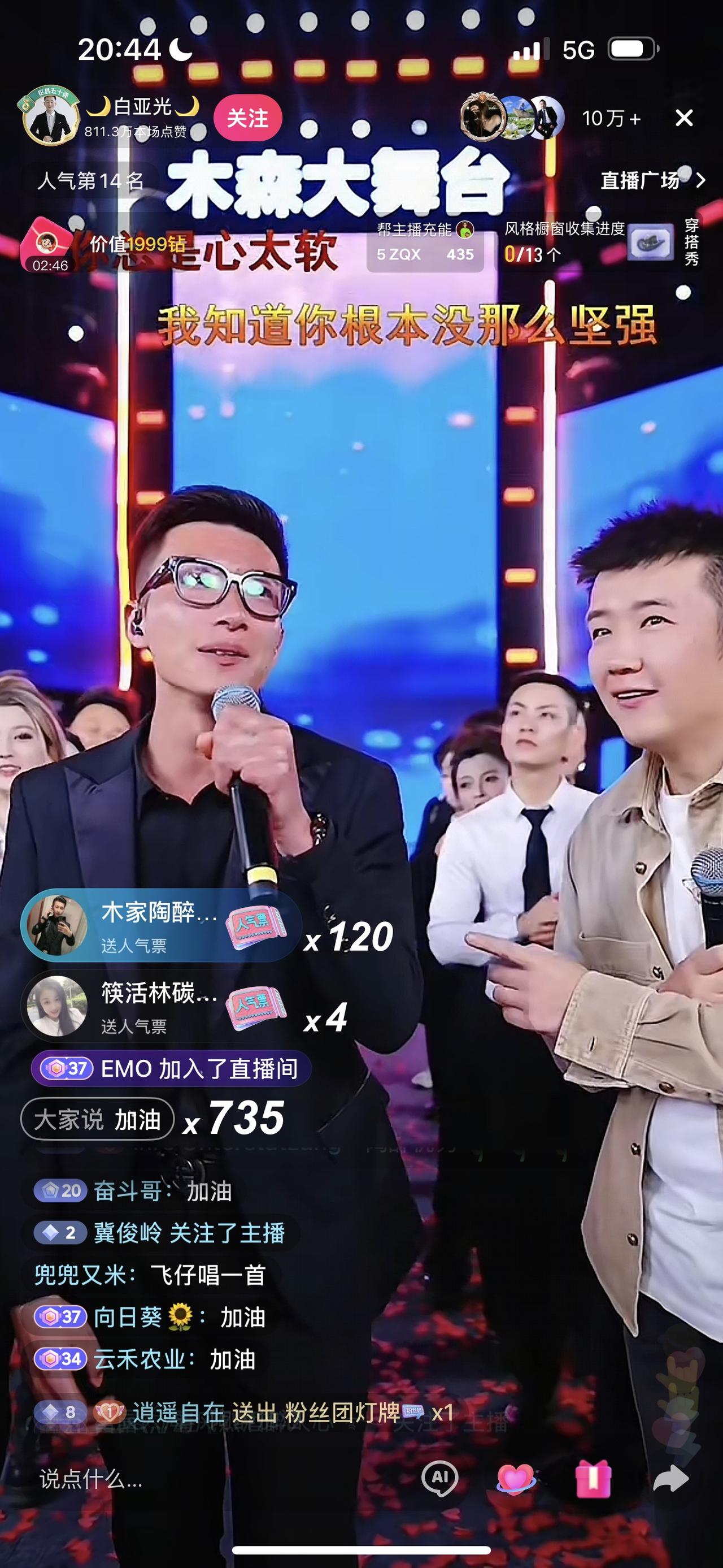 木森今晚现身白亚光大舞台,与艺人进行互动、调侃、唱歌等,直播间人气十万加以上,这是自2025年12月底木森大舞台停播后,也是木森和红豆事情发生后,木森三个月没在大舞台这样露过面,木森今晚现身白亚光大舞台,主要是:一是为木森大舞台4月15日开播进行铺垫,告知木家粉丝开播时间。二是木森今晚安排白亚光带部分艺人出外直播事宜,激励白亚光把大舞台做起来。三是4月15日晚八点木森大舞台开播后,木森欢迎人们有空去大舞台现场,进行互动,也希望更多人关注木森大舞台,他今年一定把大舞台节目内容做好,给粉丝们带来精彩的情绪价值。