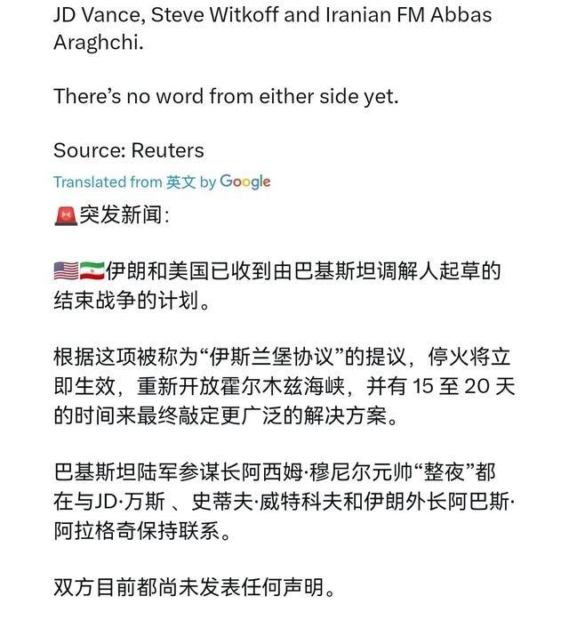 4月6日,外媒报道说,伊朗和美国已经收到一份由巴基斯坦方面起草的结束敌对行动的计划。这份计划主要通过巴基斯坦来协调,涉及立即停火和恢复关键航道。巴基斯坦陆军总司令阿西姆·穆尼尔当天晚上一直跟美国副总统JD万斯、美国总统特使史蒂夫·维特科夫,还有伊朗外长阿拉格齐保持联系,沟通持续了整晚。根据这些报道,双方都拿到了这份框架文件,暂时叫做伊斯兰堡协议。