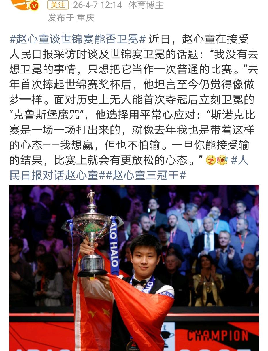丁俊晖曾说:“当年我踏碎的门槛,如今已成为大家的跑道。” 赵心童回应说:2005年,我守在电视前目睹丁俊晖夺得中国公开赛冠军,自此正式开始学球。 赵心童在接受人民日报采访时谈及世锦赛卫冕的话题:“我没有去想卫冕的事情,只想把它当作一次普通的比赛。