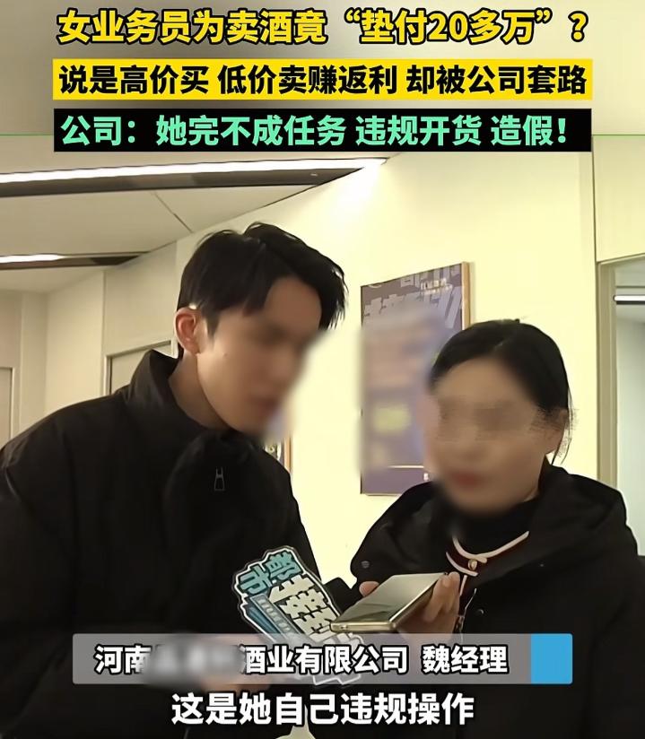 “套路?”河南,女子称自己上班2年,为了卖酒,垫了20多万进去,这是公司要求的,公司要求他们高价买酒,低价卖给烟酒店,厂家返利给公司,公司再给员工,可公司拿到钱后,却不给他们了。女子崩溃:别人上班赚钱,我上班贷款,钱没挣几个,贷款现在还剩下20多万还不上了。可公司却给出了不同说法。