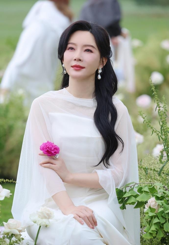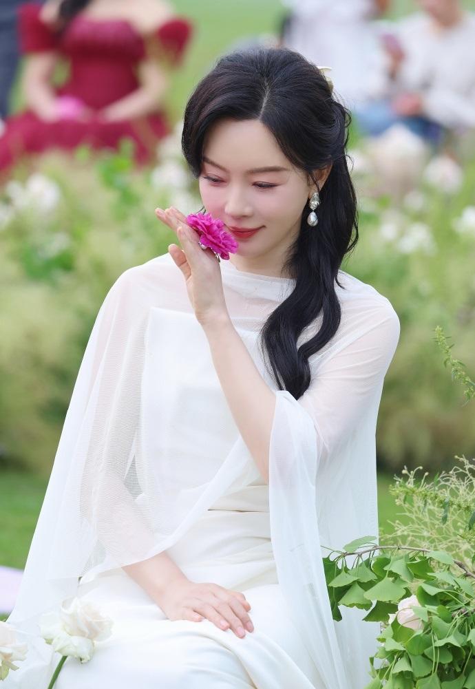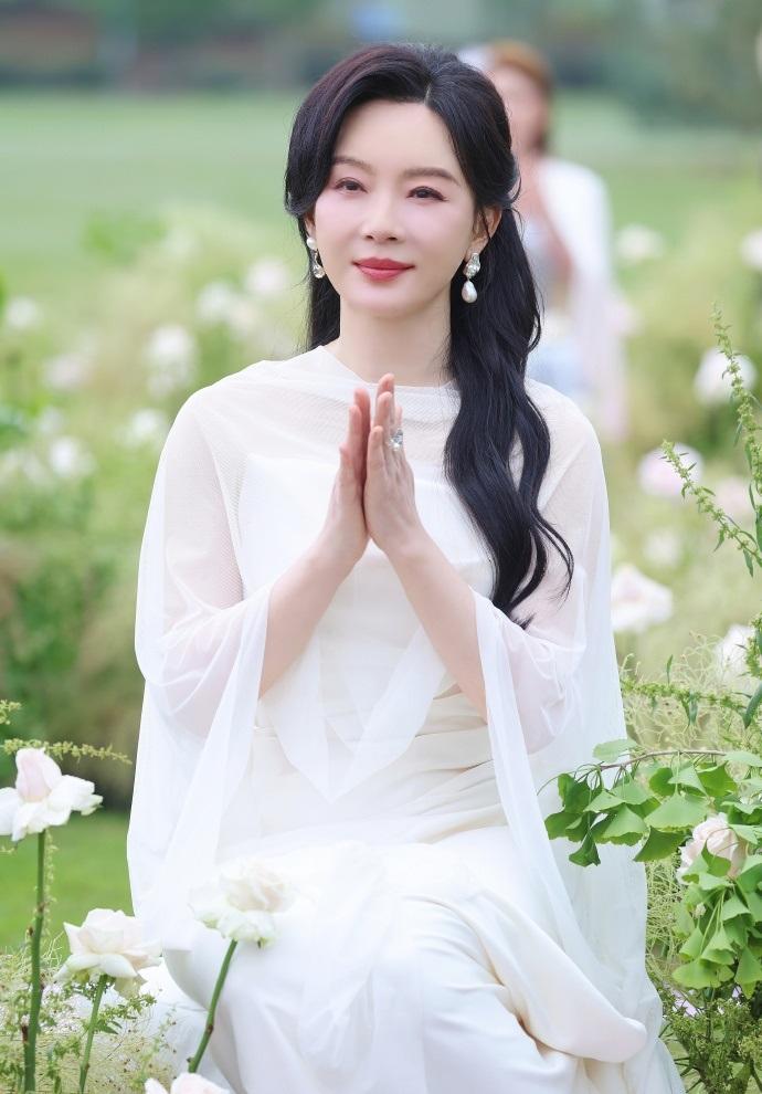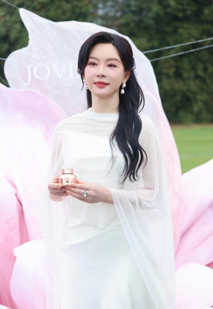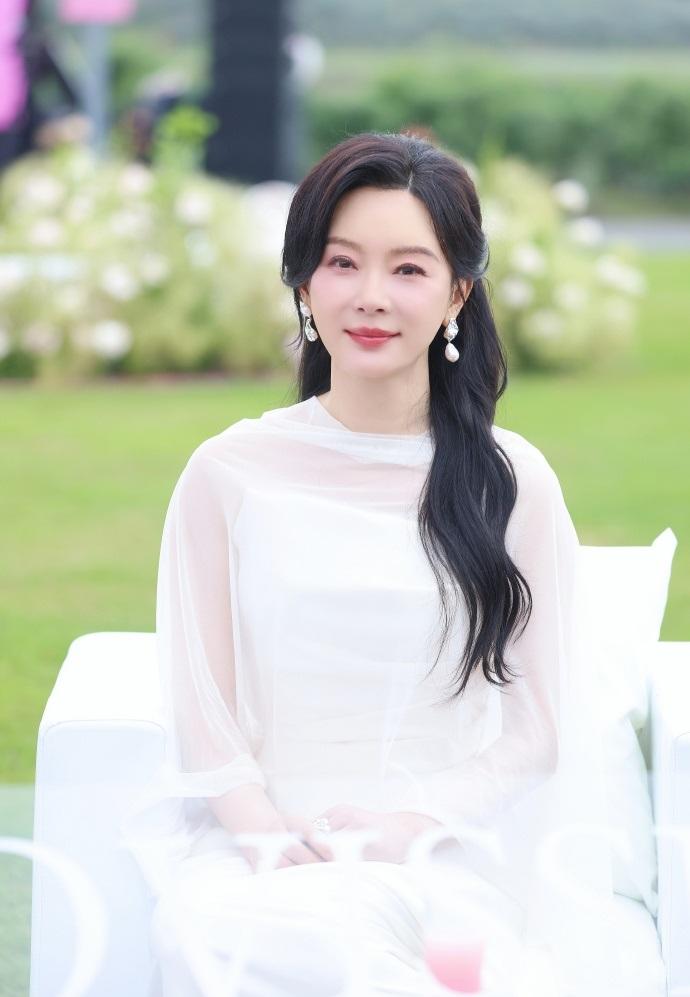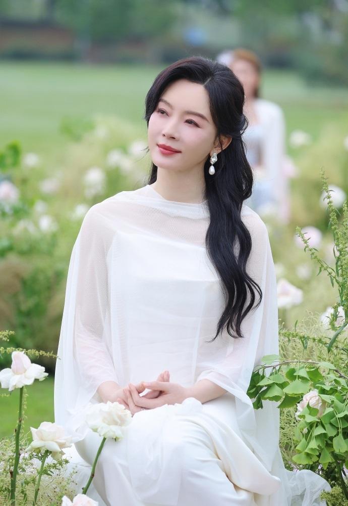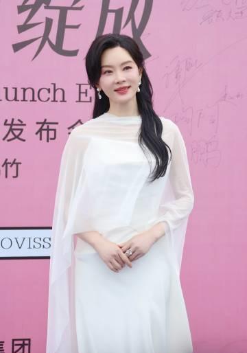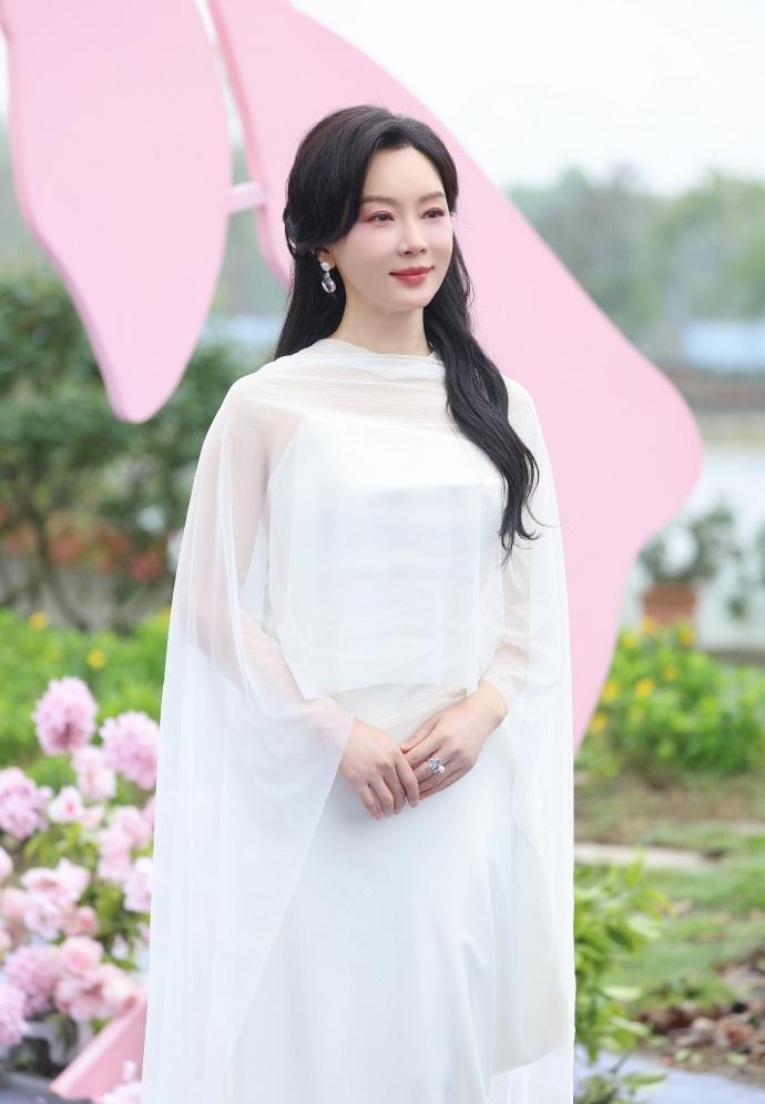 陈数上身穿非常时尚的纱制披肩,里面套着一款白色的长裙,整体效果极为出彩。