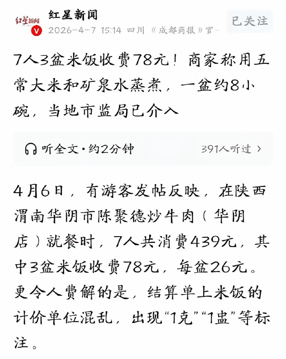 陕西渭南,7名游客在一家餐厅用餐时,3盆米饭花了78元,觉得太贵,就选择投诉,餐厅老板却说,价格很合理,我们一小碗米饭卖3元,一盆米饭可以盛8小碗,我们用的是五常大米,用矿泉水蒸制。