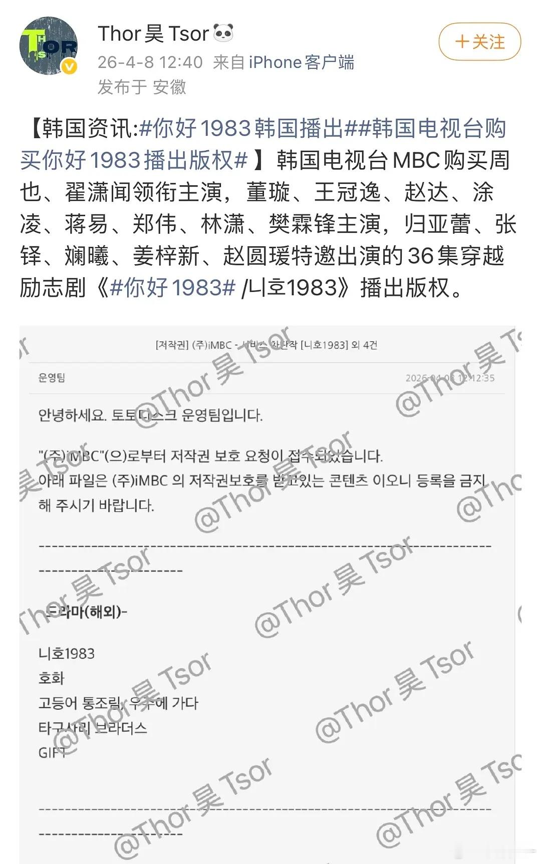 韩国电视台三大台之一的mbc买下周也主演的你好1983恭喜这个周也恭喜你好1983