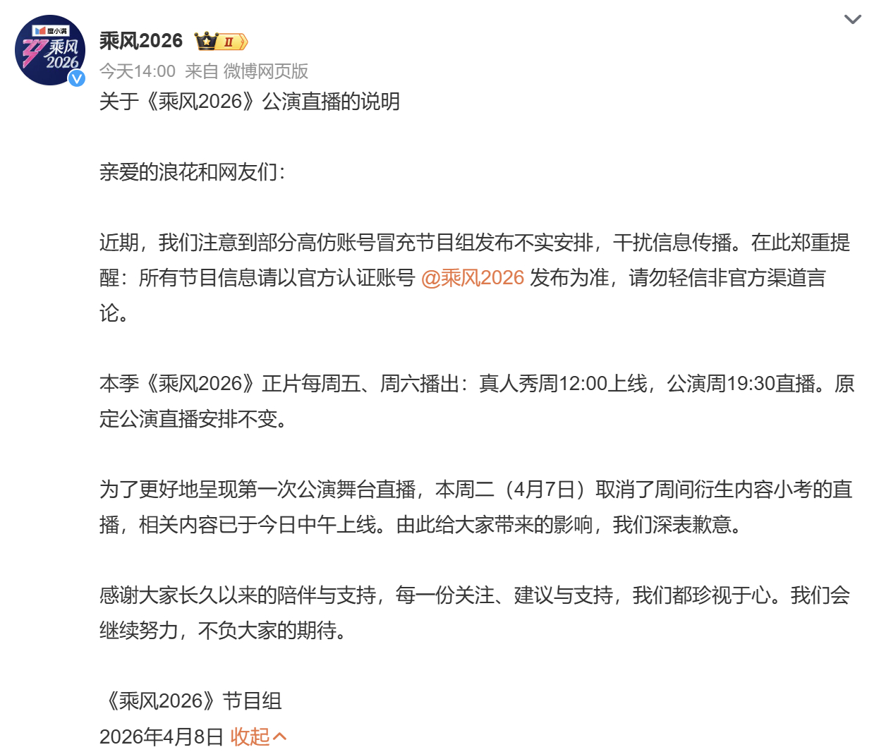 浪姐回应取消小考直播本来就是动态调整的,怎么传得风言风语的,相信乘风节目组和姐姐们就对了,她们已经在努力练习唱跳了。乘风2026