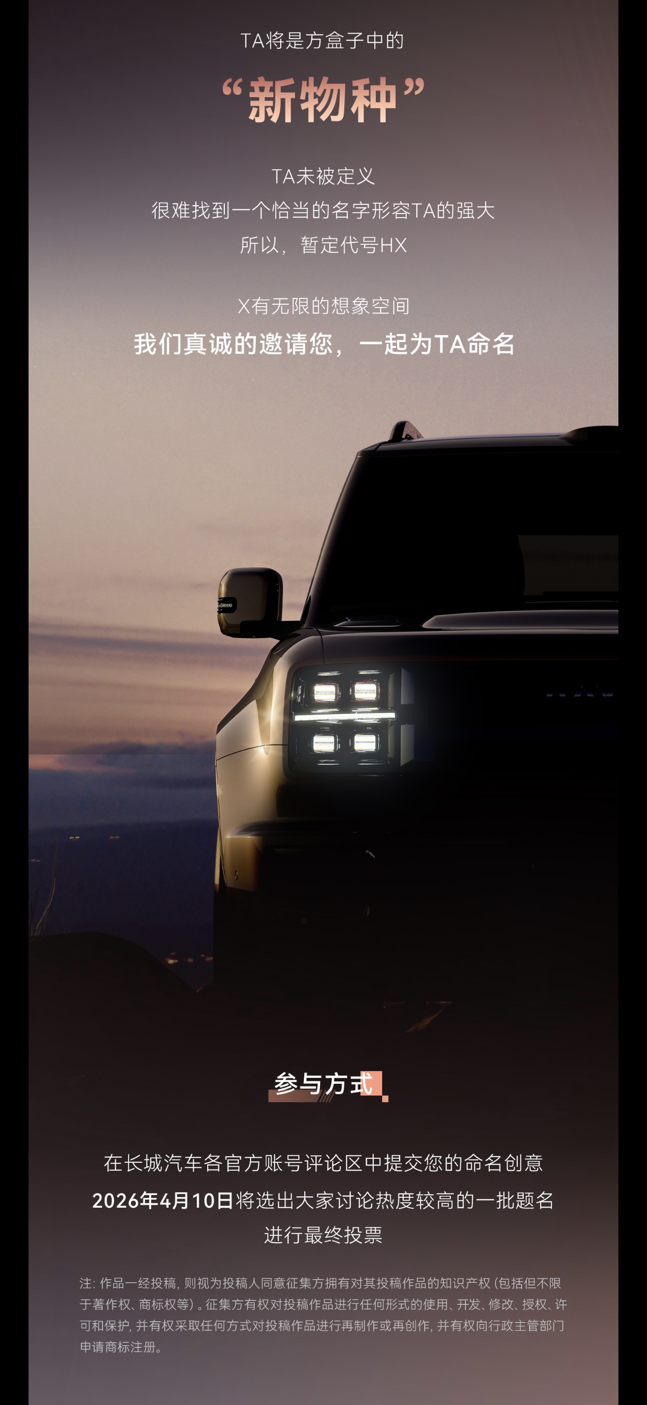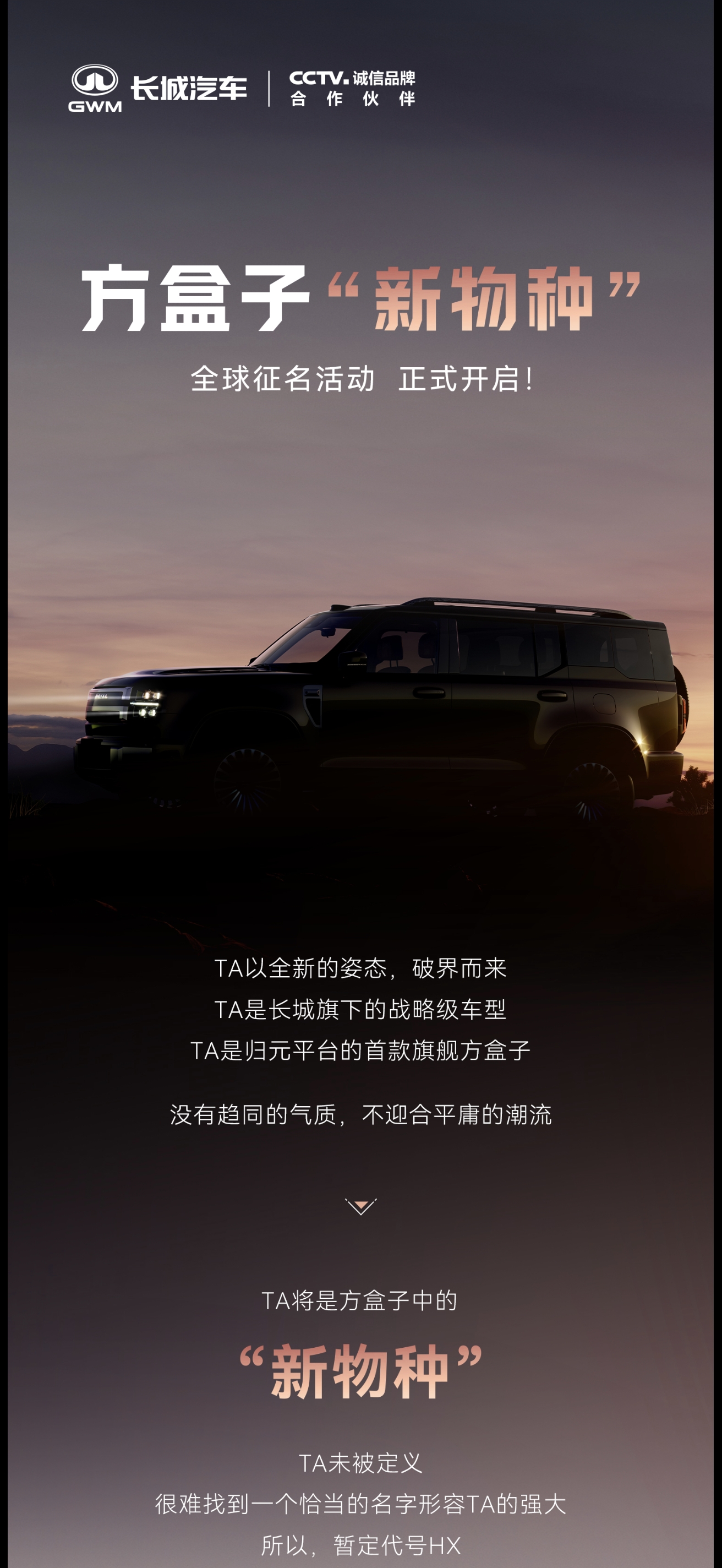 哈弗这波全球征名活动挺有意思,给“方盒子新物种”取名还得有点创意。我觉得叫“哈弗无畏”挺合适。这车采用硬派设计,车头矩形贯穿式大灯、半封闭式格栅,科技与力量感并存,一看就是勇往直前不畏惧的风格。它车长超5米,车宽近2米,轴距3000mm以上,还有高阶领航辅助驾驶功能,有实力无畏前行。而且它基于“归元”平台,搭载Hi4智能四驱,具备蟹行模式等越野能力,更配得上“无畏”二字。要是叫这个名字,感觉能凸显它的硬派特质。