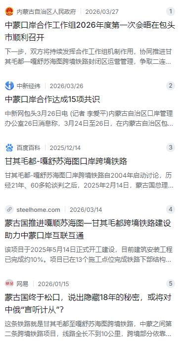 蒙古跟中国谈跨境铁路这件事,一谈就是二十多年。从2004年开始启动讨论,历经了21年、60多轮谈判,直到2025年2月,蒙古国总理奥云额尔登访华时,双方才正式签署了甘其毛都至嘎舒苏海图口岸跨境铁路的建设协议。这条路不长,线路展开全长32.6公里,但意义太大了。它从内蒙古的甘其毛都口岸出境,直接连接蒙古南戈壁省的嘎舒苏海图口岸,再往里走,就连着奥尤陶勒盖铜金矿和塔旺陶勒盖煤矿这两个蒙古最值钱的矿区。铁路在2025年5月14日正式开工建设,计划2027年建成通车,全线采用了中国标准的1435毫米窄轨,同时也配套建设了8.7公里的1520毫米宽轨。