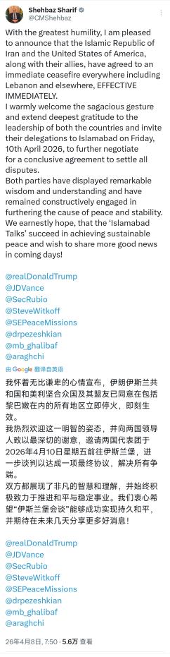 巴基斯坦总理夏巴兹·谢里夫刚刚(北京时间4月8日7:50)发文写道:“我怀着无比谦卑的心情宣布,伊朗伊斯兰共和国和美利坚合众国及其盟友已同意在包括黎巴嫩在内的所有地区立即停火,即刻生效。