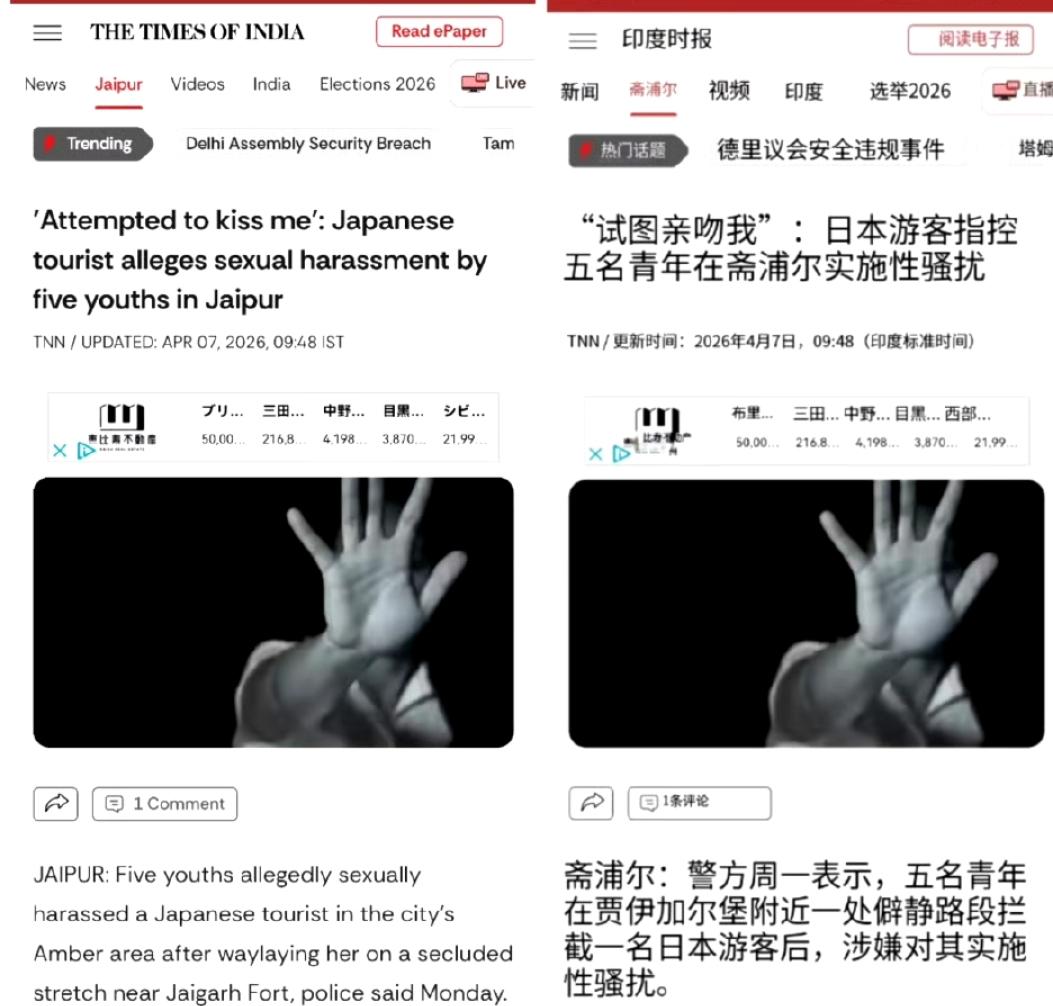 这印度还真是让人开眼。4月5号,一个日本女游客才到印度第三天,去斋普尔的杰伊加尔堡神庙路上,大白天就被5个当地男人给围了。