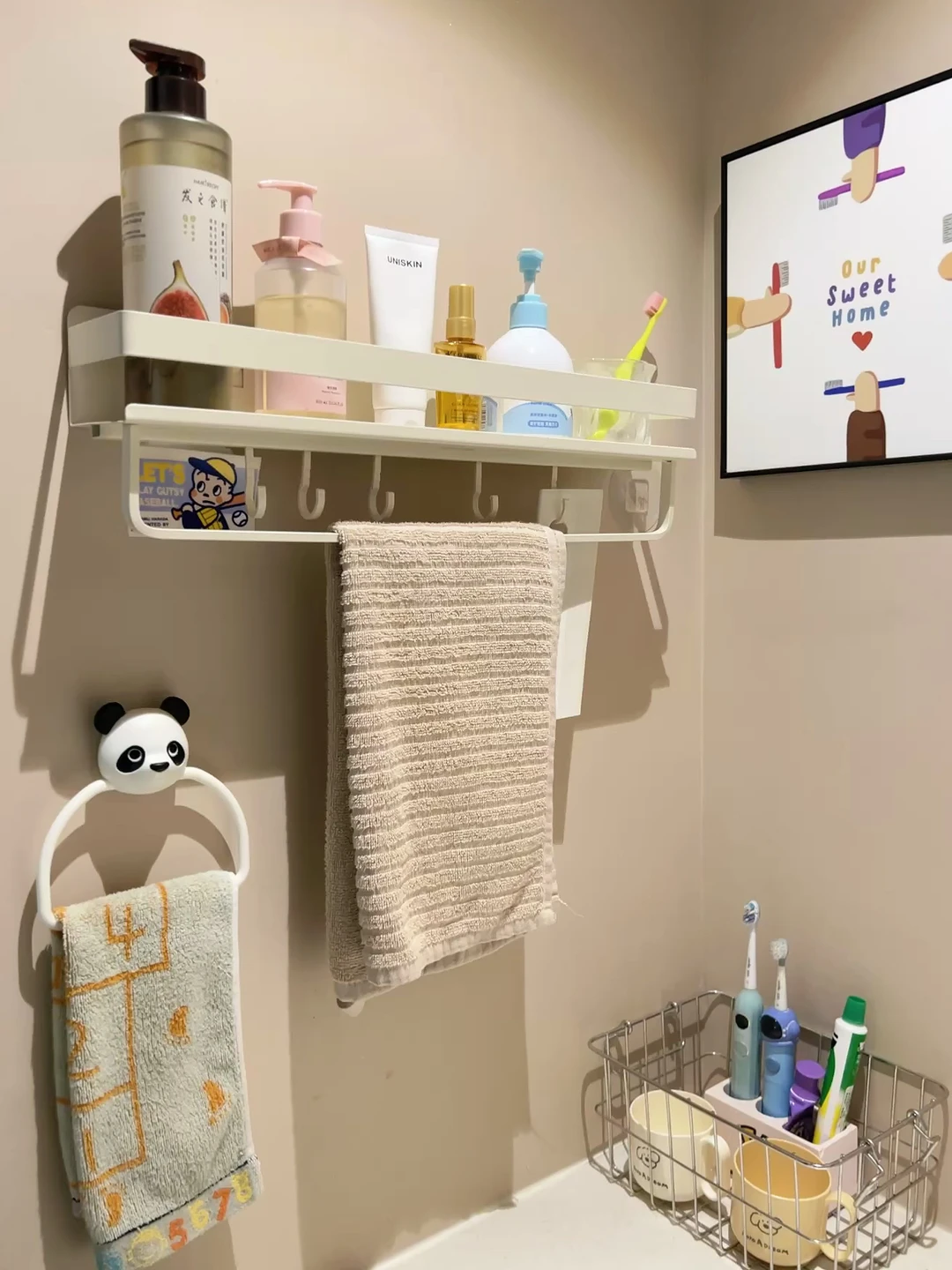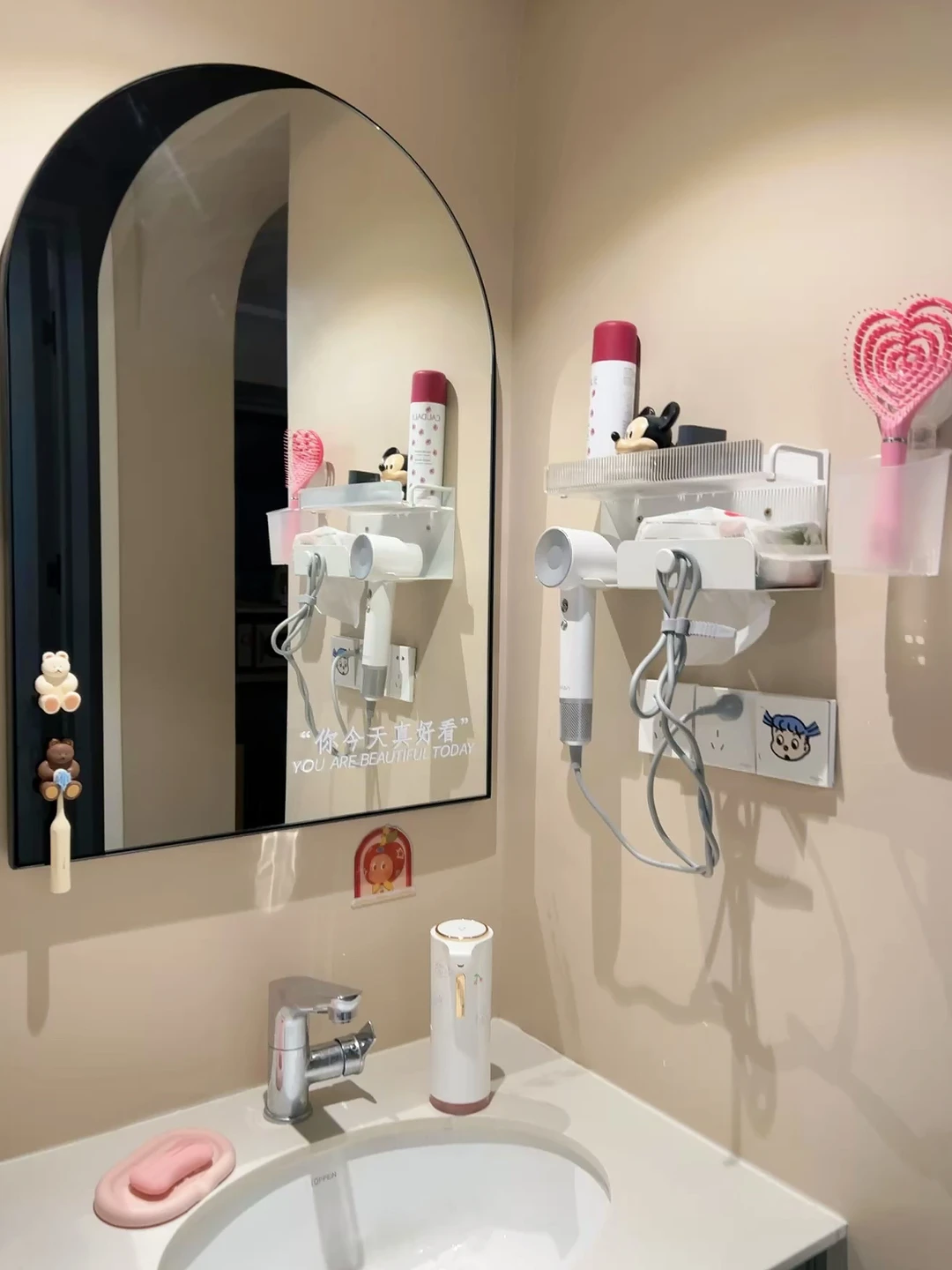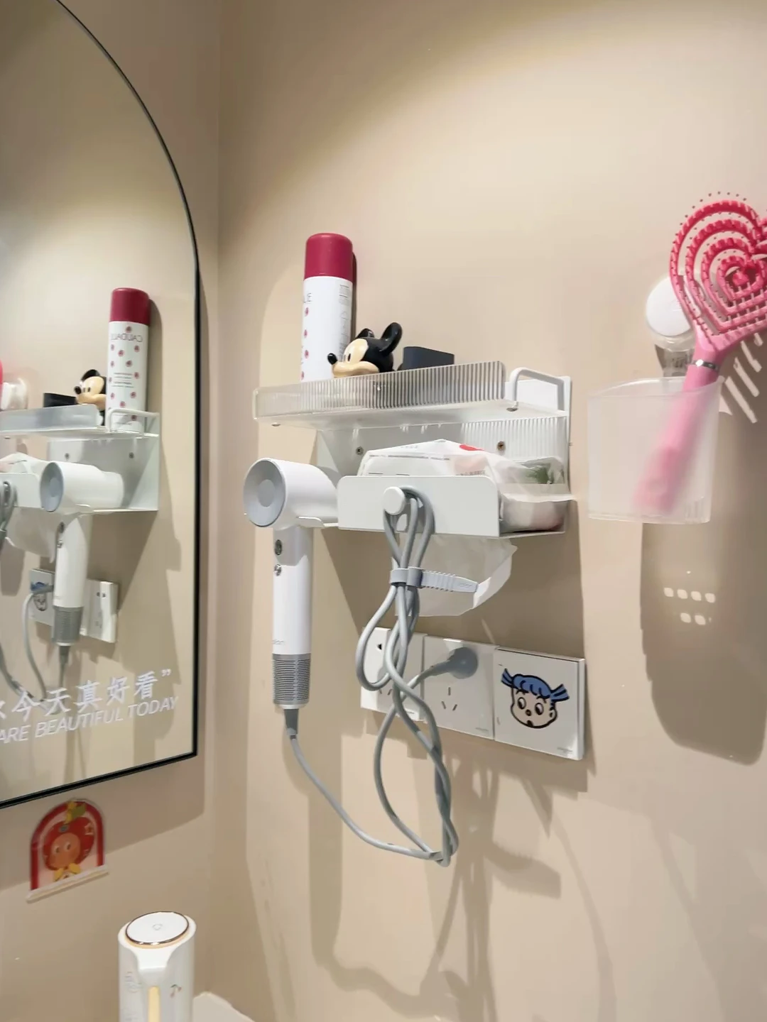 干区收纳的核心就是「能上墙不上台,能分类不杂乱」 ▫️墙面利用最大化:可免打孔吹风机架+壁挂置物架,把常用品全上墙,台面只留刚需 ▫️分区收纳更整洁:洗漱区/护肤区/清洁区分开,拿取一目了然 ▫️颜值实用兼顾:奶白色收纳架适配奶油风,可爱小装饰提升幸福感 ▫️ 牙刷收纳篮:孩子的牙刷牙膏杯子归置整齐,再也不乱糟糟 小户型直接抄作业吧!