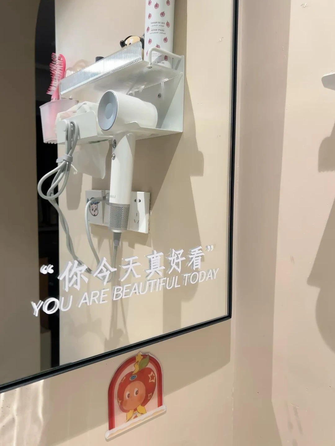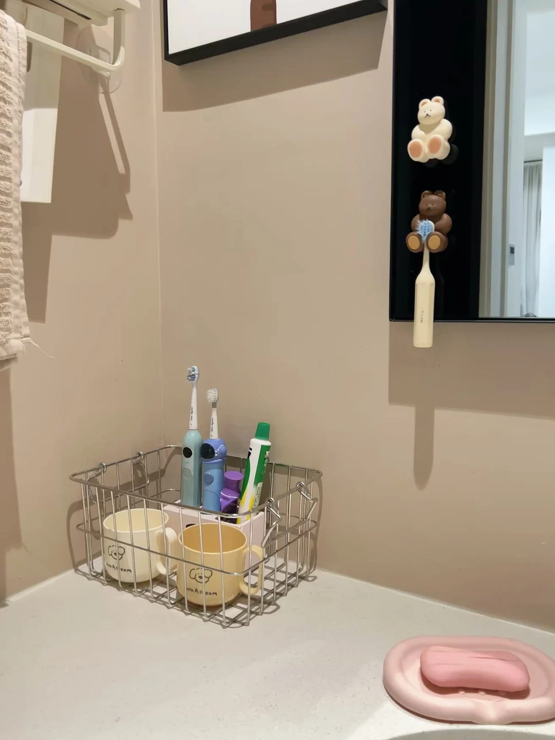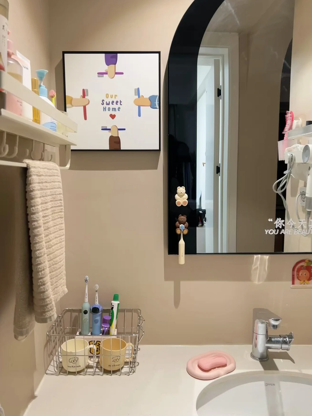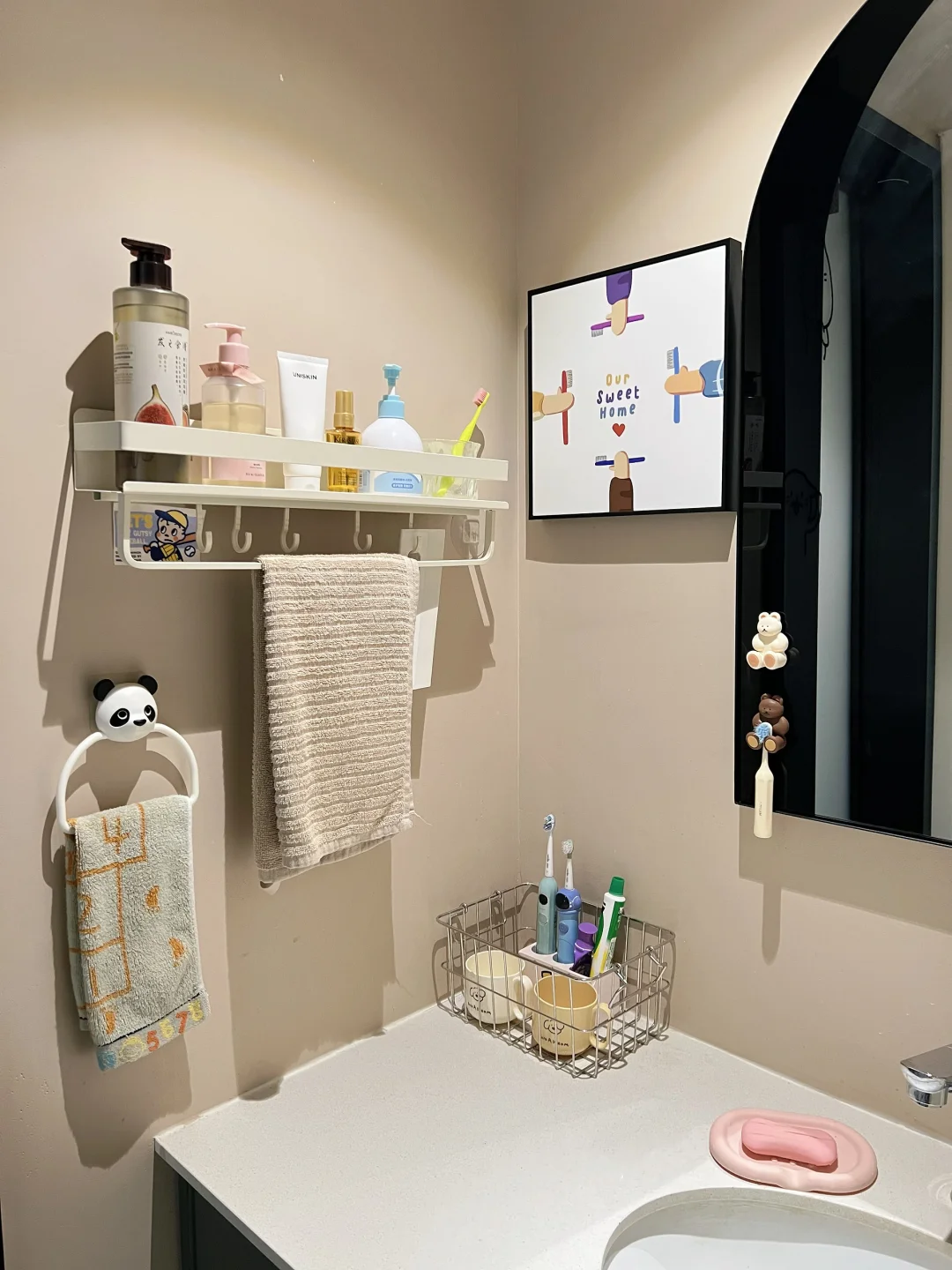 干区收纳的核心就是「能上墙不上台,能分类不杂乱」 ▫️墙面利用最大化:可免打孔吹风机架+壁挂置物架,把常用品全上墙,台面只留刚需 ▫️分区收纳更整洁:洗漱区/护肤区/清洁区分开,拿取一目了然 ▫️颜值实用兼顾:奶白色收纳架适配奶油风,可爱小装饰提升幸福感 ▫️ 牙刷收纳篮:孩子的牙刷牙膏杯子归置整齐,再也不乱糟糟 小户型直接抄作业吧!