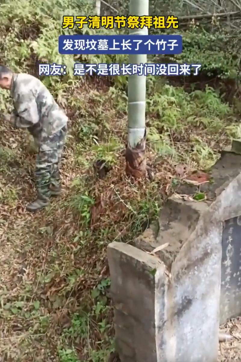 江西,一男子清明上山祭祖,结果到了地方,却发现祖先的坟上竟然长了一根竹子,而且不偏不倚的长在了坟头正中间,网友:这是不是很长时间没回来了?