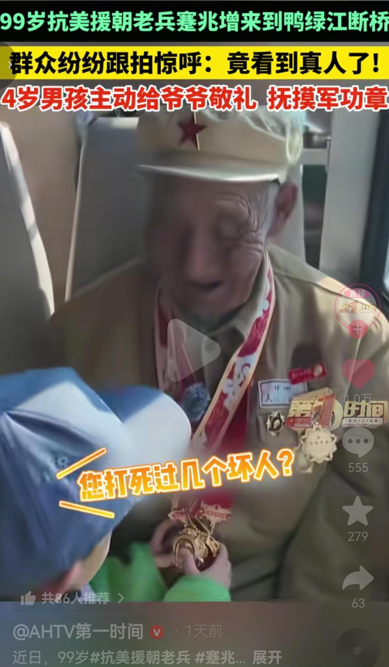 99岁抗美援朝老兵重走鸭绿江断桥!4岁娃摸军功章敬礼,全网破防哭崩了!网友:这才是我们该追的星,这才是刻在中国人骨子里的传承!