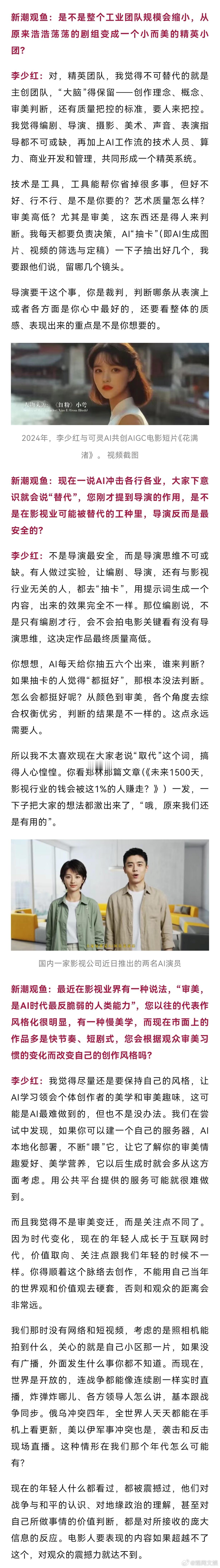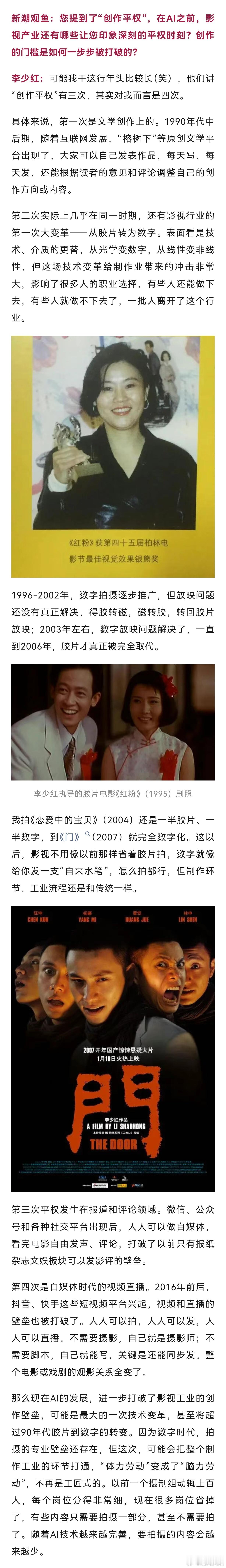 【独家对话李少红:AI重塑了影视剧组,却重塑不了创意】李少红说AI取代论是在制造恐慌李少红说影视这行是可以干一辈子的3月底,国际影视工业科技创新大会在北京举行,新潮观鱼独家对话导演、监制。她认为,在AI时代,人的判断力和审美的稀缺性依然存在,就像当年数字电影“取代”了胶片电影,大家慌慌张张地拆了洗印厂,现在胶片又流行了,再重建洗印厂,说明大家认可胶片存在的价值。