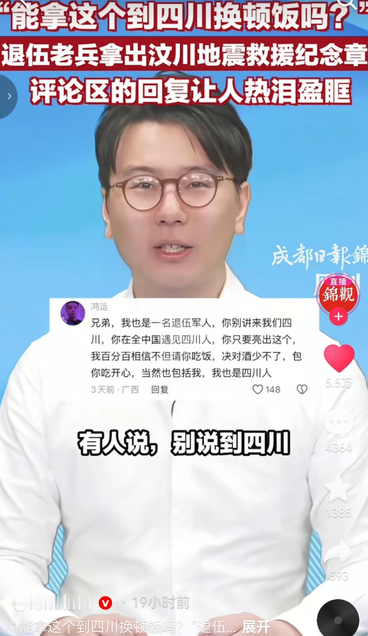 四川网友直接把话挑明了:“兄弟,你要是戴着这枚章来四川,吃住我全包,好酒管够,绝对少不了!””有人喊:“别说一顿饭,你来四川,大门永远开着,当年你拿命救我们,现在我们养你一辈子都应该!”商家主动站出来,免费提供食宿、工作机会。