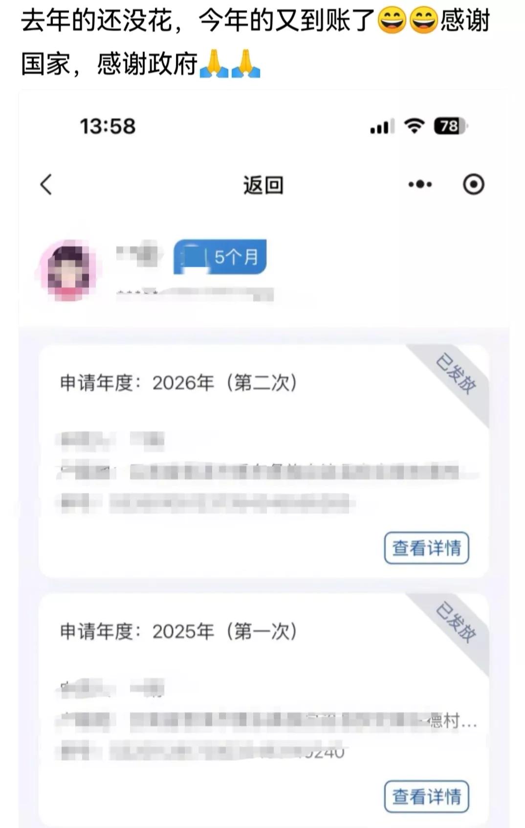 有人发了一张育儿补贴的截图,说去年的没用,今年又发了。