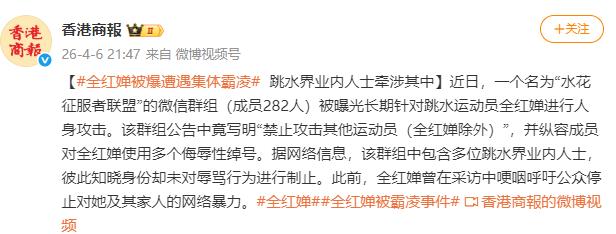 近日,一个名为“水花征服者联盟”的微群组(成员282人)被曝光长期针对跳水运动员全红婵进行人身攻击。难以想象,一位为国争光的年轻运动员,竟会遭到这样有组织、有预谋的恶意围攻,实在令人寒心。