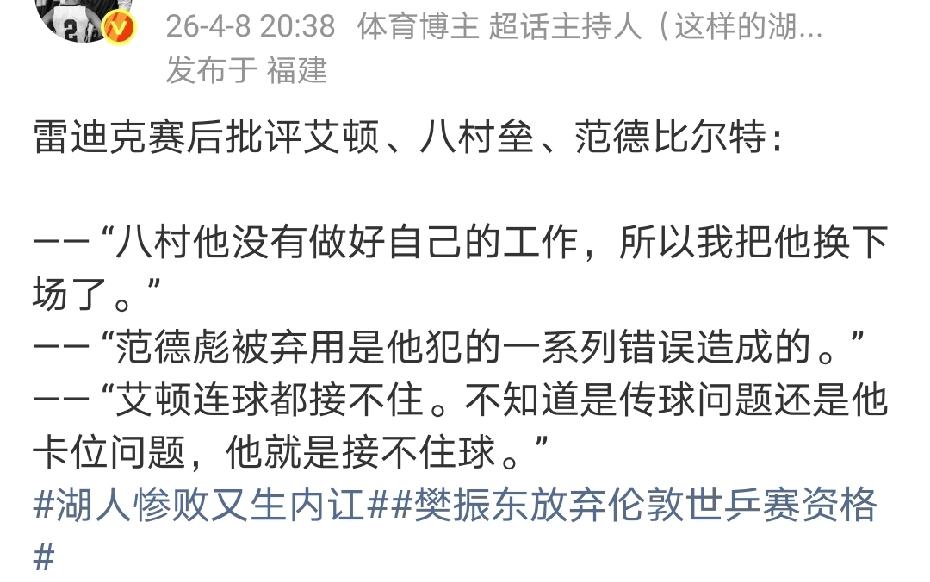 湖人惨败爆发内讧!湖人不敌雷霆在情理之中,但比赛中范德彪与主帅雷迪克发生激烈争执。 范德比尔特被DNP,全场只打了5分钟,赛后他直接离开球馆,拒绝接受任何采访。 雷迪克很难控制湖人更衣室了,赛季结束,估计他就要离开湖人。