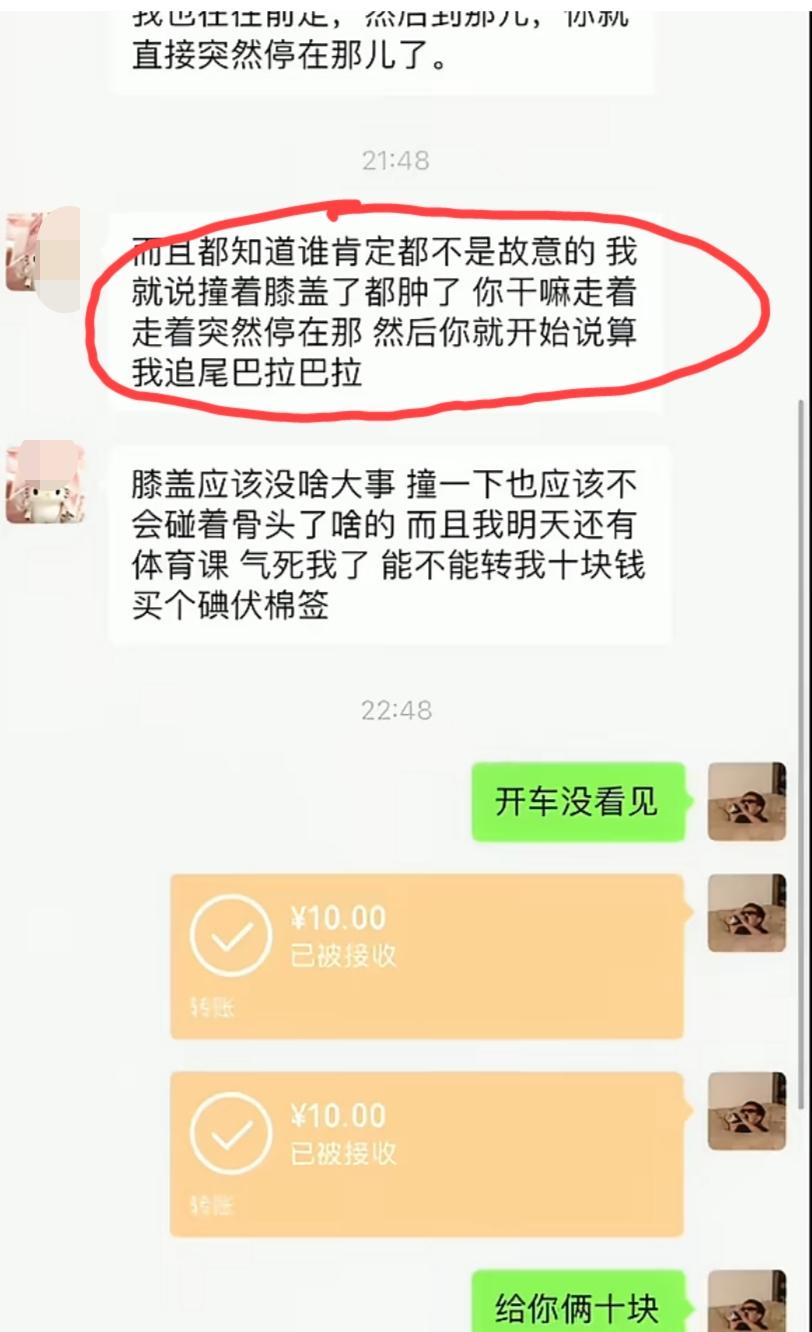 转头女孩的骚操作真的让人大跌眼镜。在微信里女孩告知膝盖已经肿了,第二天还要上体育课,希望能要10元红包购买碘伏棉签。男子也是大方之人,直接转去两个10元的红包。
