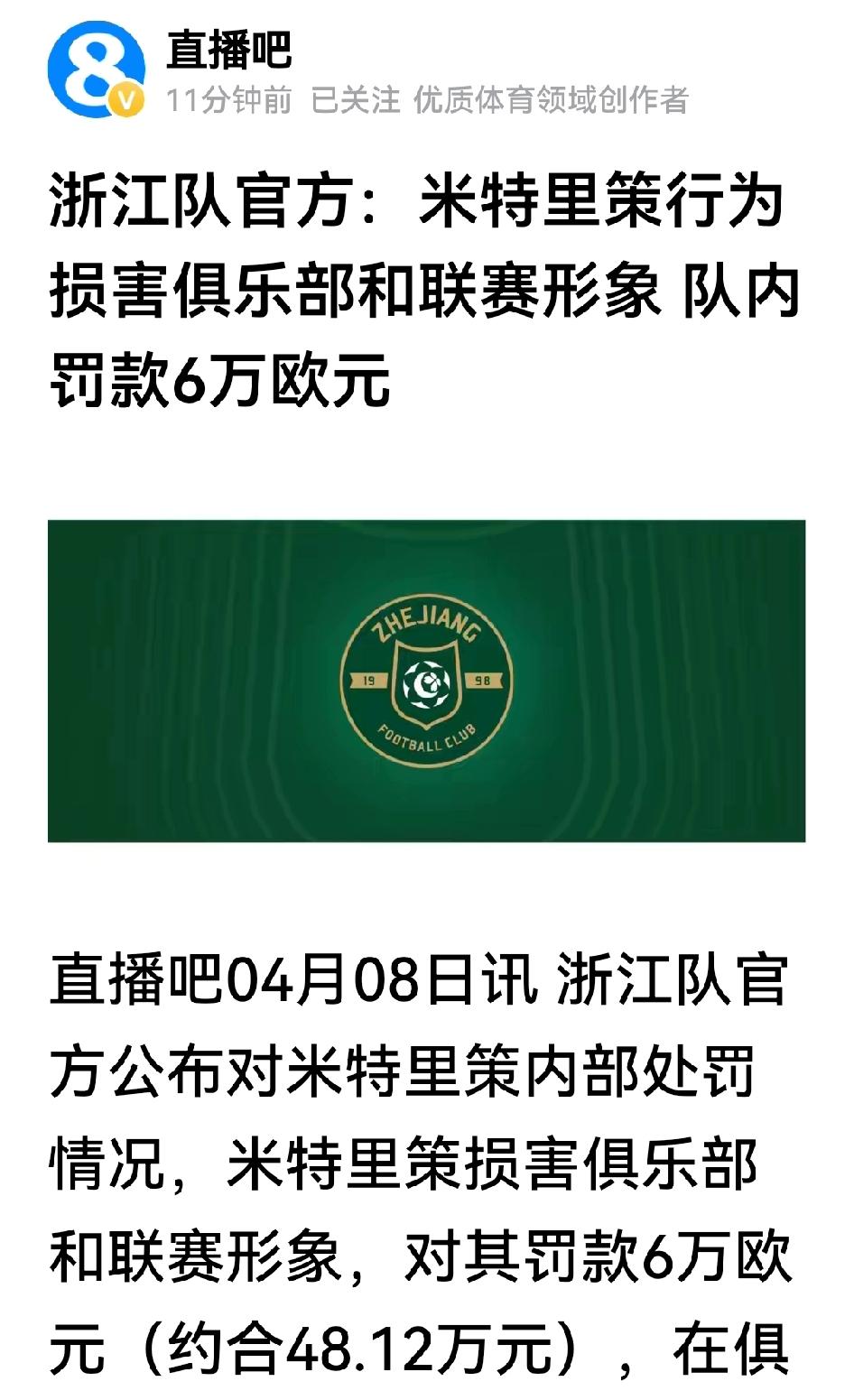 意料之中,中足联对其追加停赛4场、罚款人民币4万元。意料之外,浙江俱乐部队内通报批评,还追加罚款6万欧元,看清楚:6万、欧元。