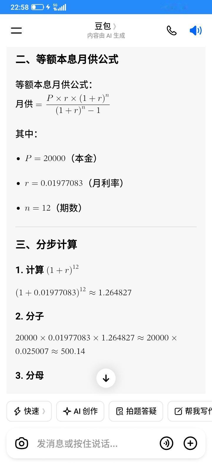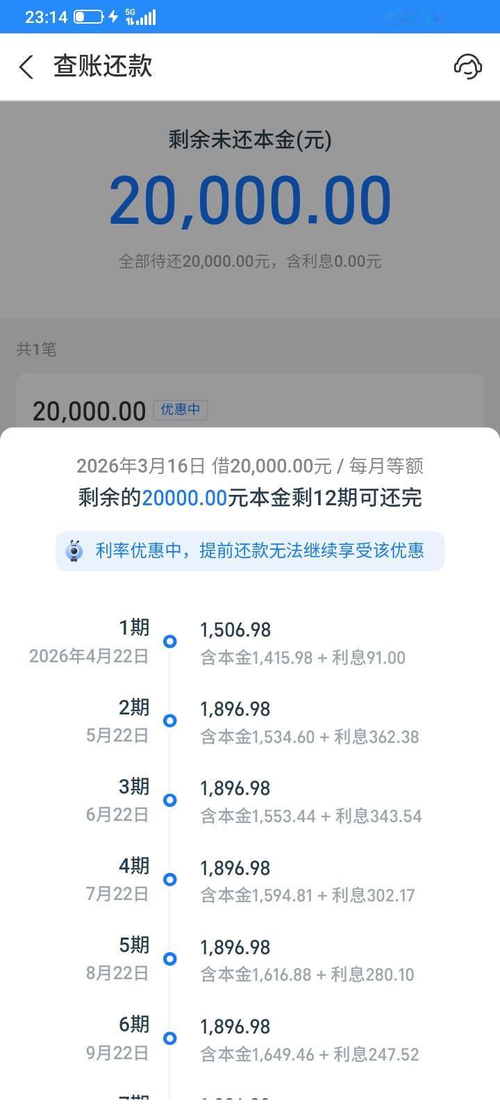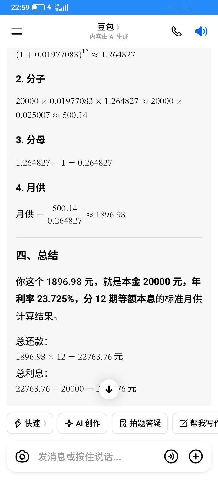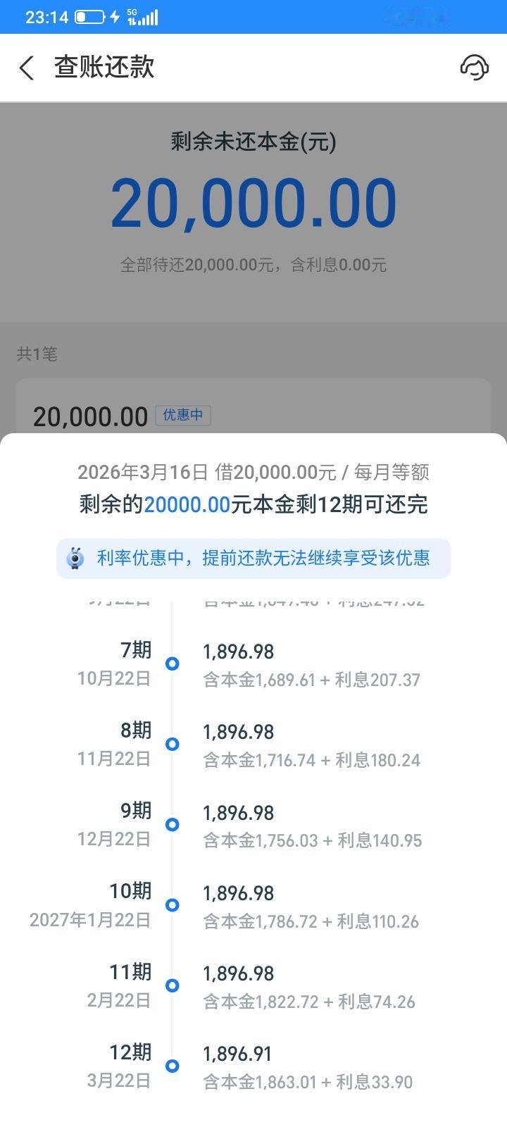 我在借呗借了2万块钱,日息是一万块一天6.5元利息,分12期还,现在一般都是等额本息还款,每个月需要还1896.98元,我找豆包给我算,这个钱是怎么算出来的,它给我算出来了,是按照日息乘以30天,算出月息,然后月息复利算出年息,和平台标的单利略微有点出入,稍微高一点点,算出总的利息,然后加上2万本金,再除以12期,得到每期需要还1896.98元。第一个月欠的本金最多,是2万元,30天,利息就是390元,1896.98元减390元,还的本金就是1506.98元。第二期欠的本金就少一些了,第二个月还是还1896.98元,利息就是360.61元,还的本金就是1536.37元,以此类推,最后一个月还是还1896.98元,利息是33.90元,本金是1803.01元。也是在能够承受的范围。