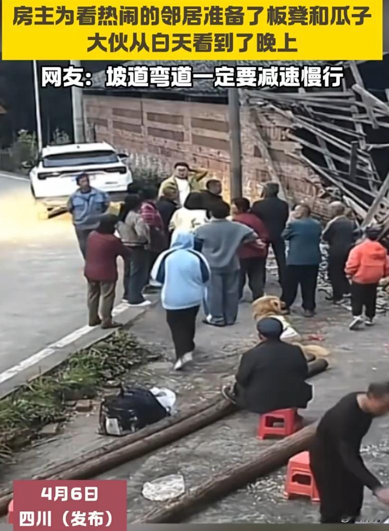 换一般人,家被撞成这样,早该急眼了。但这位大姐的操作绝了,她不光没发火,还搬出一排塑料凳子,端出一盘瓜子,招呼大伙坐下慢慢看