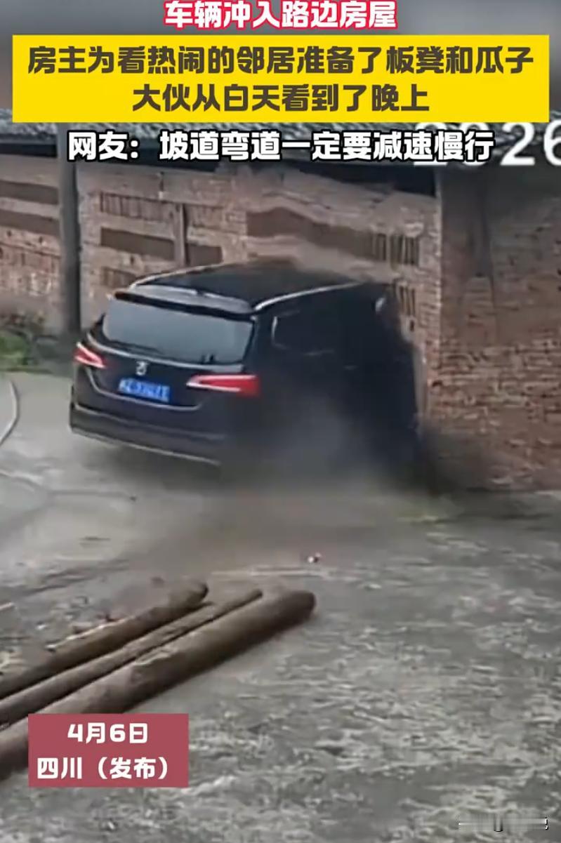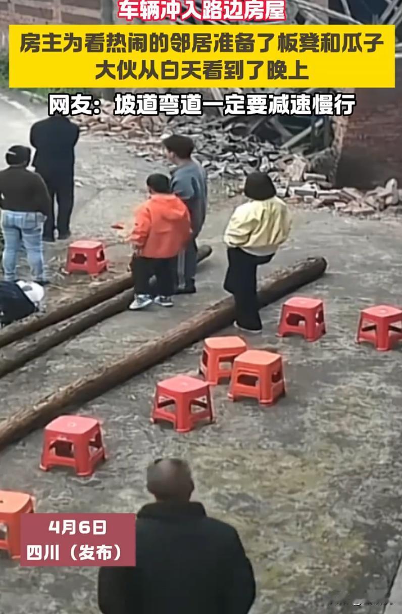 这心态绝了!四川,女子家平房就在路边,一司机开车过弯减速不急,直接撞进了女子家中,不少邻居听到声音后纷纷前来吃瓜,而女子并没有生任何人的气,反倒是搬出塑料板凳供邻居围观,期间还给他们发瓜子吃
