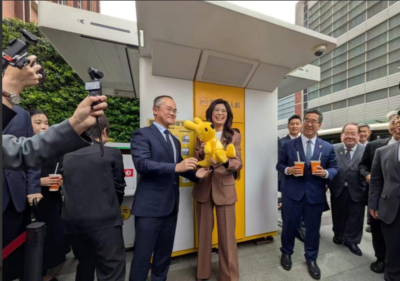 郑丽文更是亲自上手,完整体验了一次无人机点单的全过程。她现场下单的一杯奶茶,在极短的时间内就由无人机精准送达指定取餐柜,全程高效稳定,没有丝毫拖沓。