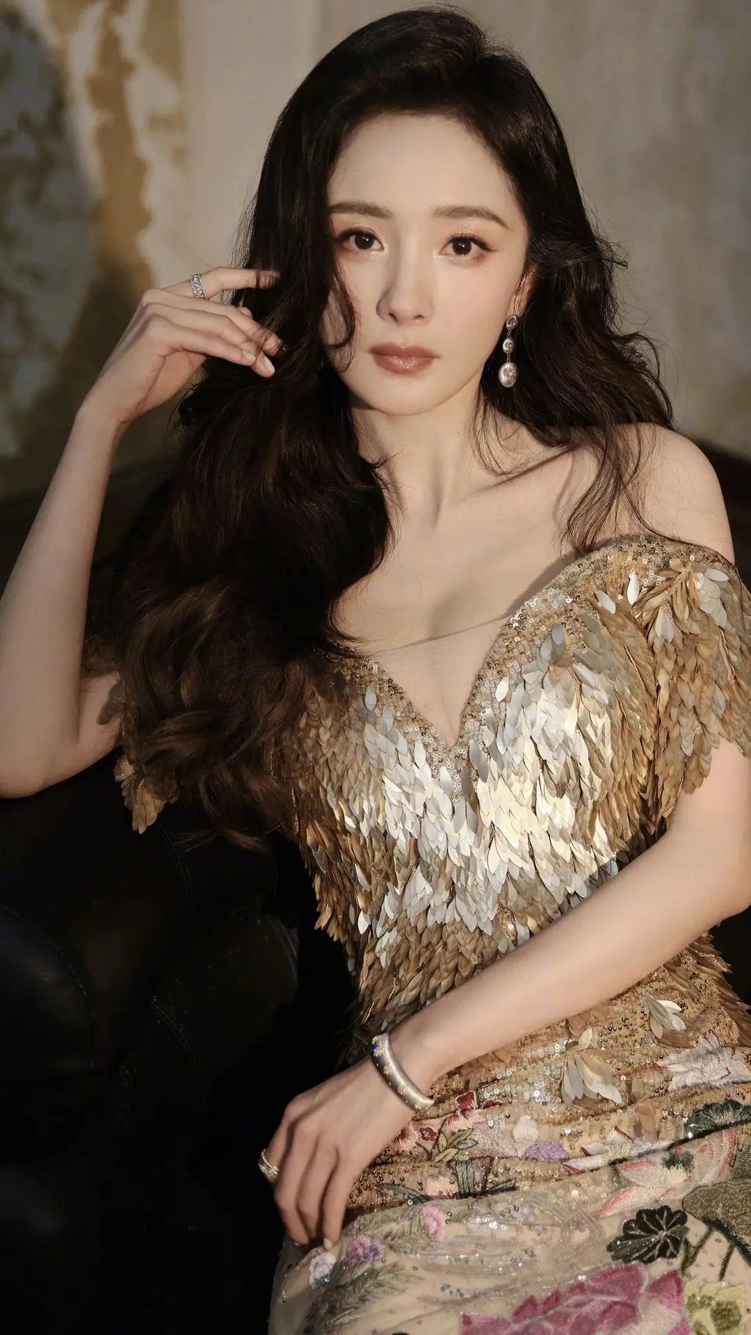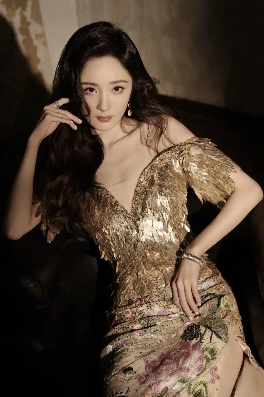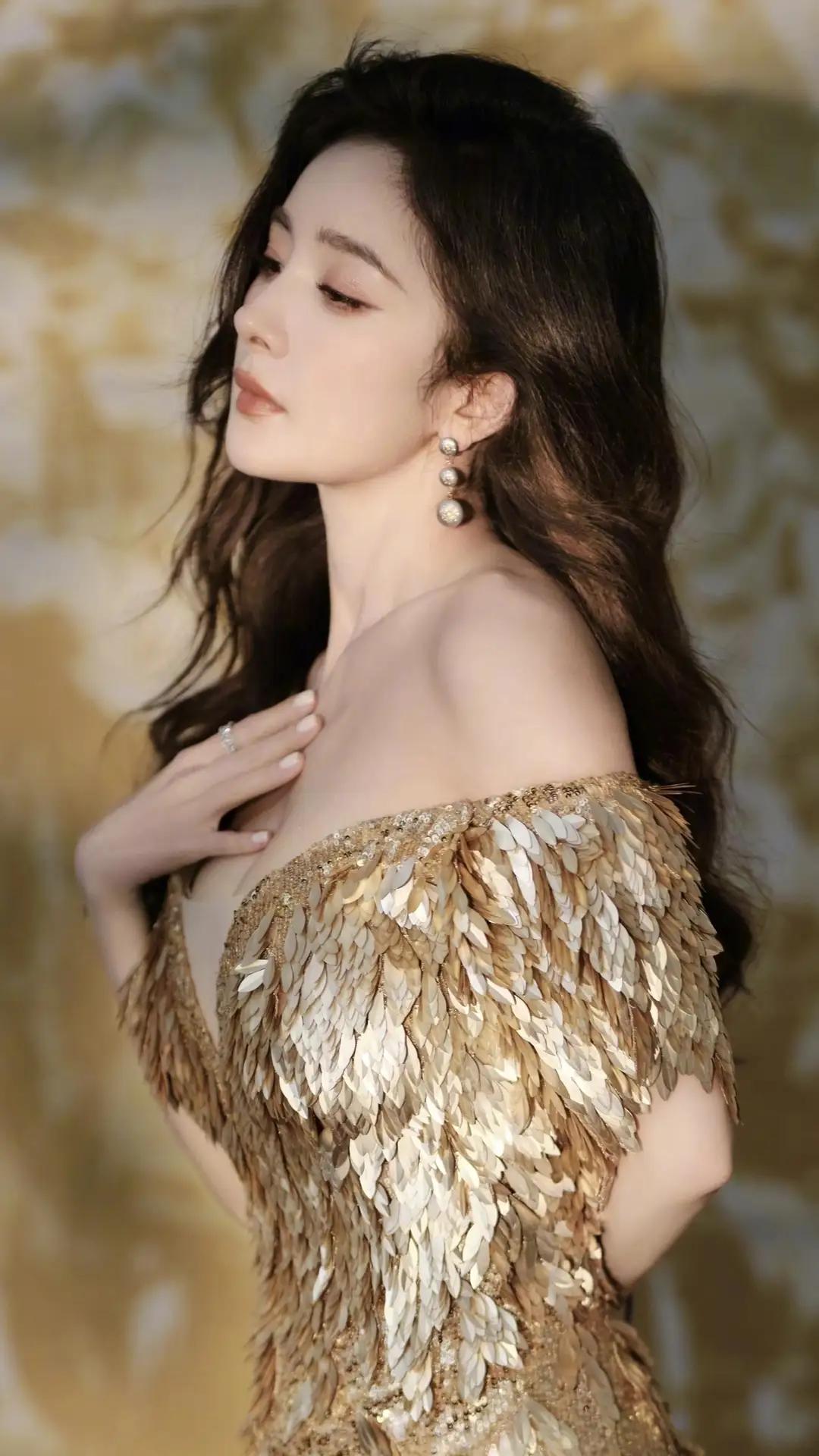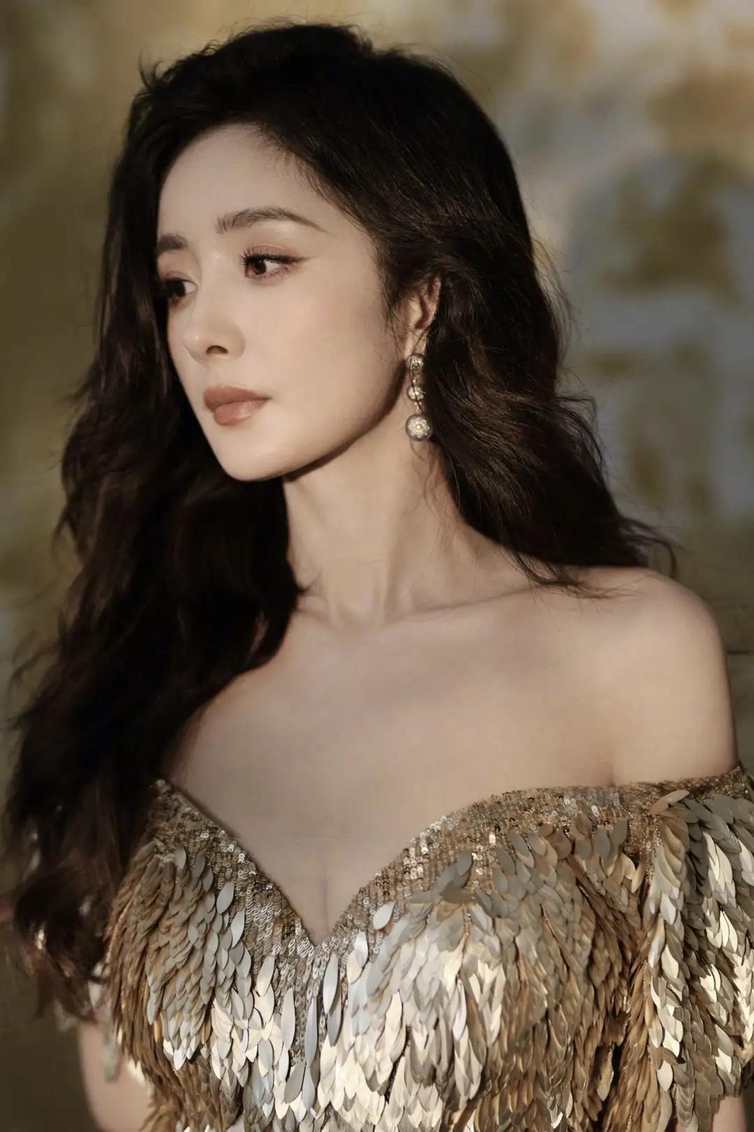 杨幂一袭金鳞露肩礼服,将贵气与柔美揉进每一寸细节。亮片如羽翼缀满裙身,在光影间流转璀璨;