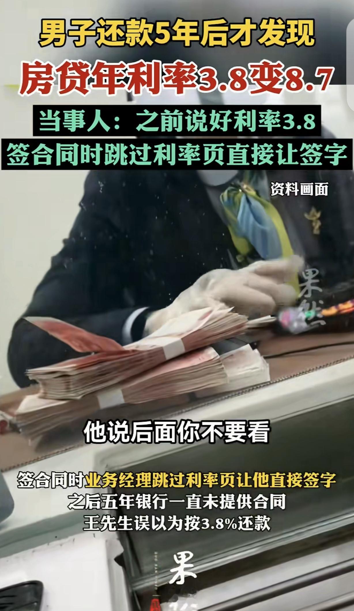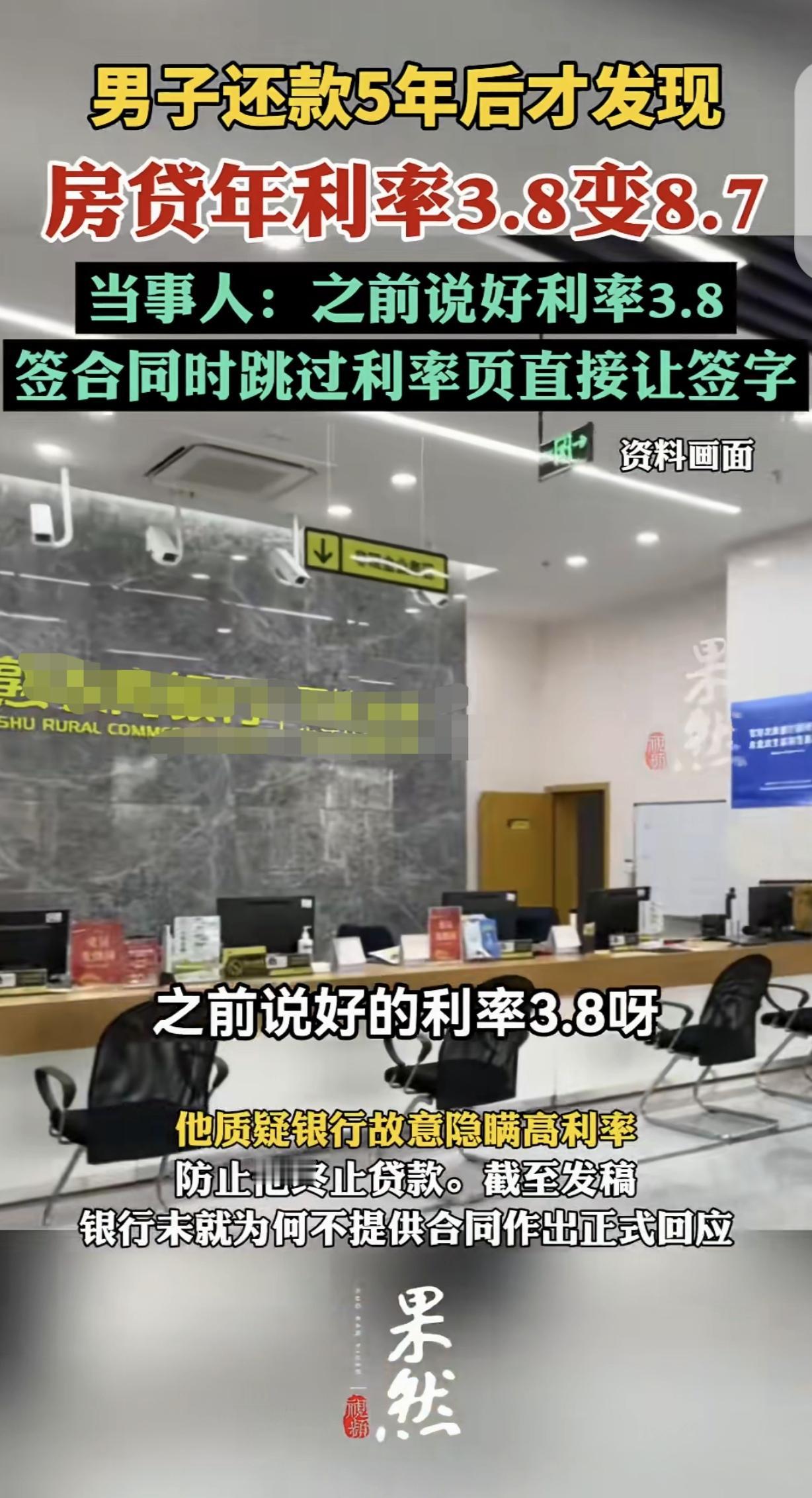 “吃相太难看了!”江苏常熟,一男子通过中介买了套房,贷款68万,中介给他推荐一利率3.8%的银行,说低于4大行的4.8%-5.8%,每月还款8500元,能省不少钱,男子乐坏了,以为捡了个大便宜,可签合同时,中介跳过利率页,让他直接签字,更奇葩的是,男子稀里糊涂还款5年,银行都没给他合同,男子准备提前还款,才发现合同利率竟然是8.7%。男子怒了,他质疑银行隐瞒高利率,可银行就是死猪不怕开水烫,就是不回应这件事。