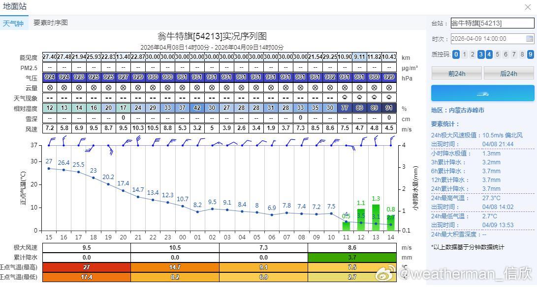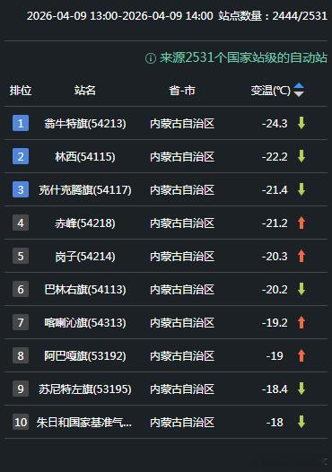 【气温急升骤降】今天因为冷空气和阴雨雪的影响,内蒙古中部和东南部降温10-20℃,部分站点超20℃。同比14时,翁牛特旗降24.3℃,从27℃降到2.7℃,而且气温倒降,下午比凌晨还低。降幅超20℃的还有:林西降22.2℃、克什克腾旗21.4℃、赤峰降21.2℃、岗子降20.3℃、巴林右旗降20.2℃。