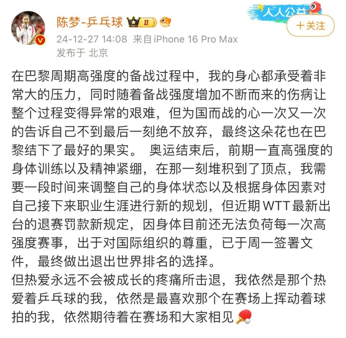 运动员自主弃赛的深层原因 运动员主动弃赛,远非“不想打”那么简单,背后是身体、职业、规则、心理的多重博弈,也是现代体育职业化的必然阵痛。樊振东、陈梦退出WTT世界排名,直指“不参赛就罚款”的霸王条款。高额罚金与严苛赋分规则,逼得顶尖球员不敢因伤退赛,甚至带伤硬撑。当商业化规则凌驾于运动员健康之上,弃赛就是对冰冷体系的无声抗争。理解他们的选择,体育不该只剩输赢,更该有人的温度。