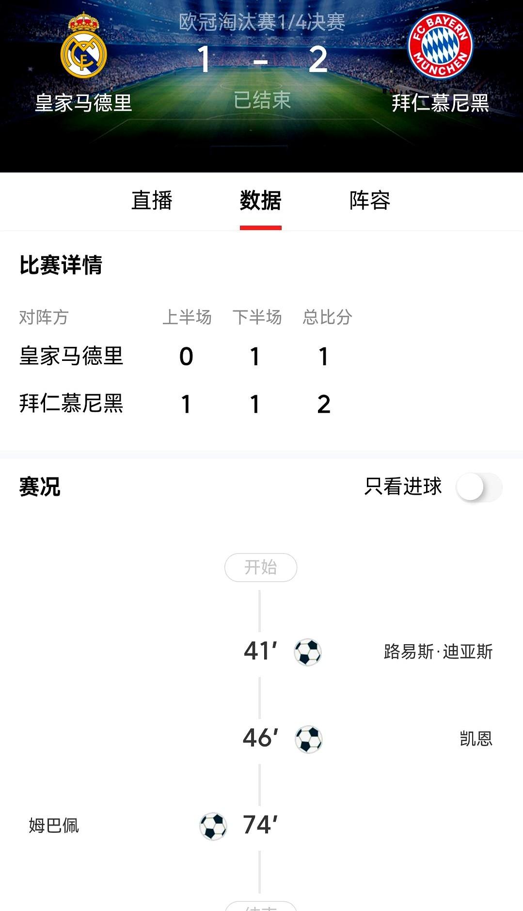 欧冠四分之一决赛首回合炸了!拜仁客场2-1硬刚皇马,终结了14年的不胜魔咒。路易斯·迪亚斯和凯恩分别建功,凯恩这赛季都49球了,真是猛!诺伊尔也神扑不少。