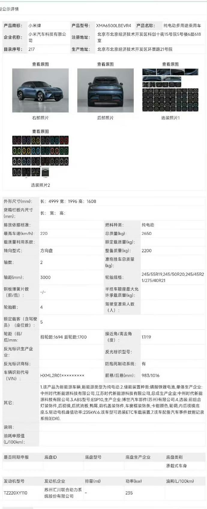 新款小米YU7申报了: 整车重2.2吨(比现款 2.315 吨轻) 235kW