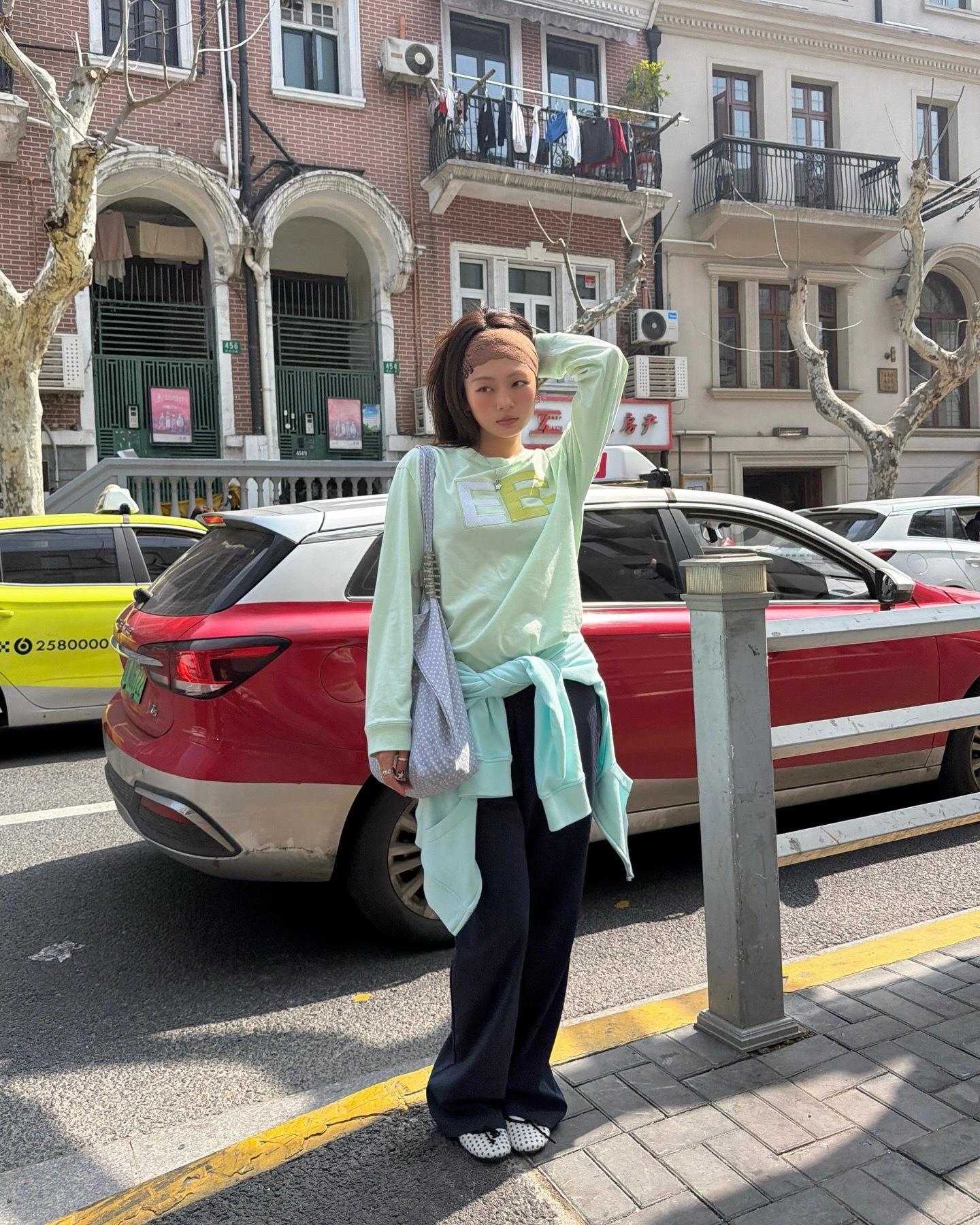 OOTD时尚穿搭今天穿什么ootd水蓝色长袖搭配复古牛仔裤短裤真是活力满满