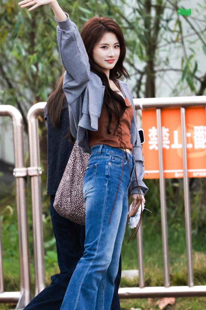 她下身穿了一件蓝色的高腰牛仔裤,让她彰显出了完美的身材比例,确实是特别的有魅力。