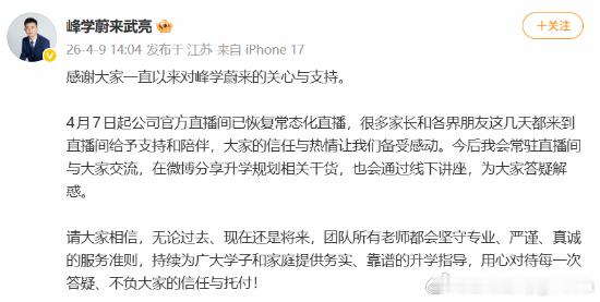 张雪峰接班人发声回应复播4月9日消息,峰学蔚来总经理武亮发文,就公司官方直播间复播事宜作出回应。武亮表示,感谢大家一直以来对峰学蔚来的关心与支持。4月7日起公司官方直播间已恢复常态化直播,很多家长和各界朋友这几天都来到直播间给予支持和陪伴,大家的信任与热情让团队备受感动。今后他将常驻直播间与大家交流,在微博分享升学规划相关干货,也会通过线下讲座,为大家答疑解惑。武亮承诺,无论过去、现在还是将来,团队所有老师都会坚守专业、严谨、真诚的服务准则,持续为广大学子和家庭提供务实、靠谱的升学指导,用心对待每一次答疑、不负大家的信任与托付据悉,在4月7日上午7点,峰学未来旗下官方账号“张雪峰团队讲升学规划”复播,由峰学未来总经理武亮亲自出镜开播。作为网友公认的张雪峰接班人,也是与张雪峰风格最为相近的老师,武亮的露面引发不少网友感慨。直播过程中,武亮不仅回应了公司运营状况,还与家长进行连麦互动。针对近期相关疑问,他解释 “峰学蔚来” 与 “峰学未来” 均为公司在用名称,并明确标注,公司旗下众多教师账号中,带有 MCN “峰学未来” 标识的均为官方认证账号,同时坚定表态 “我们一定会做下去”。第三方数据平台显示,该账号开播5小时观看人次超过600万人,直播间在线人数峰值超过13万。