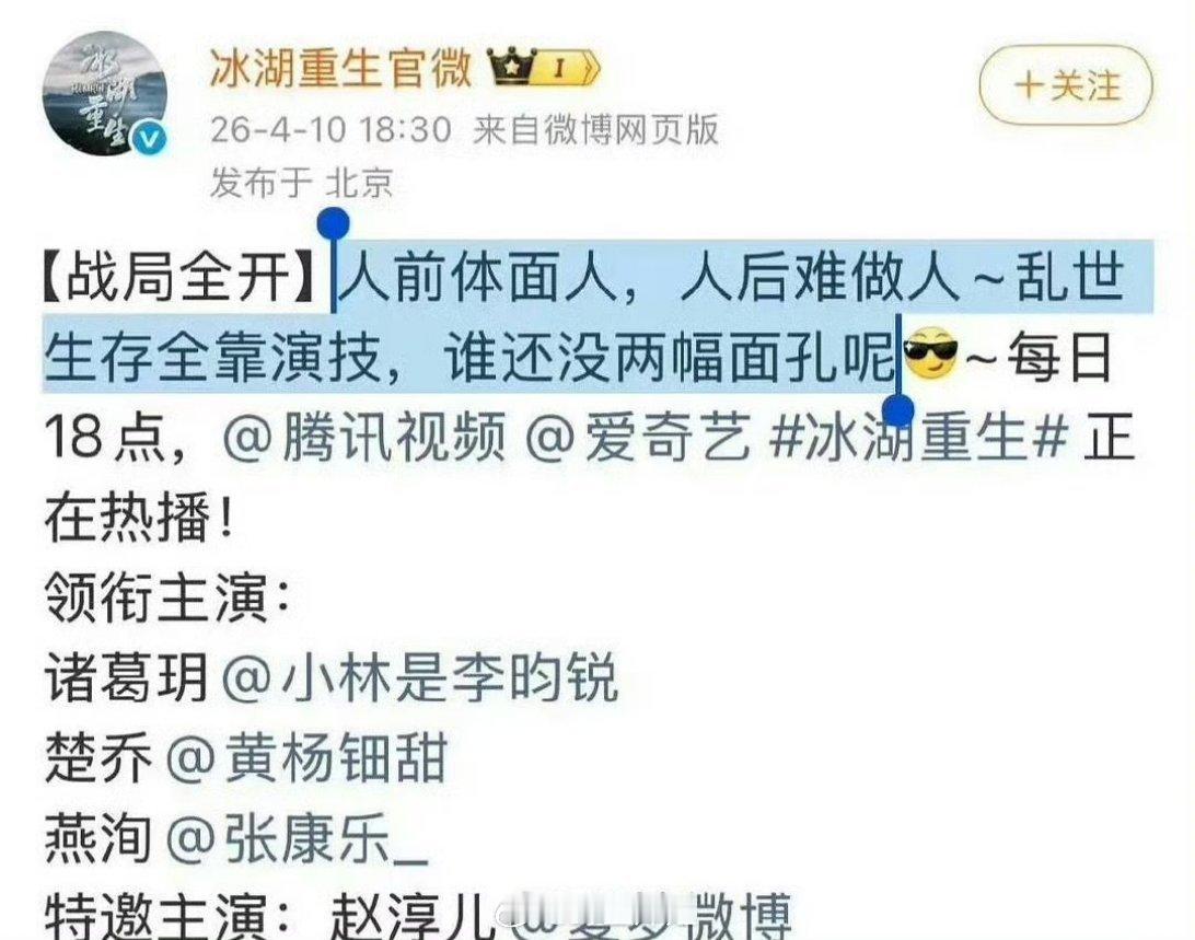 哦豁,《冰湖重生》的官方微博还发文说“人前体面人,人后难做人~乱世生存全靠演技,谁还没两副面孔呢”,这是在内涵什么呢?