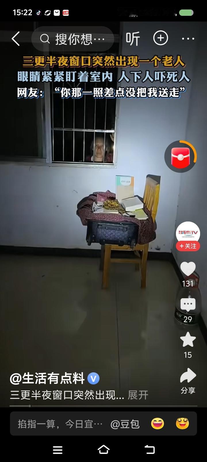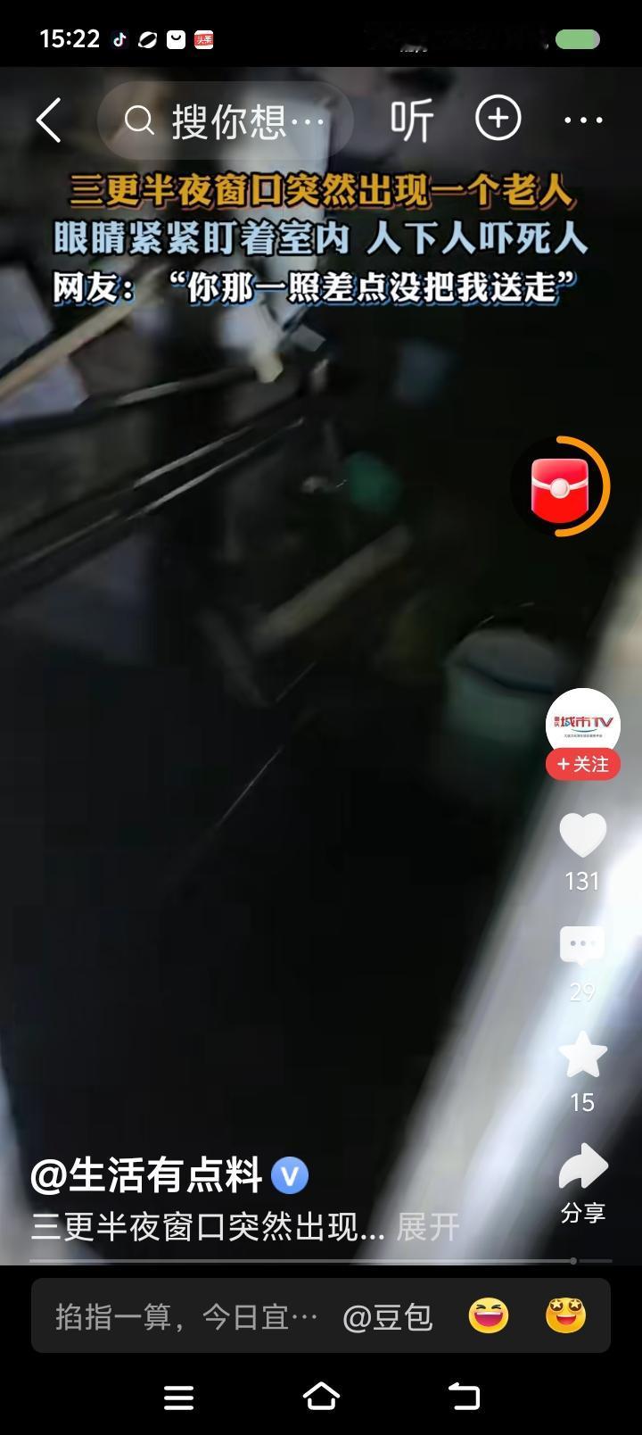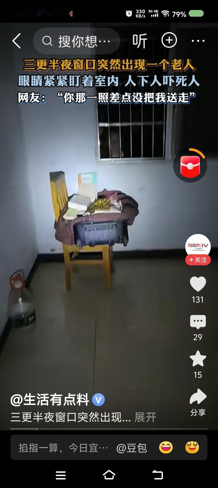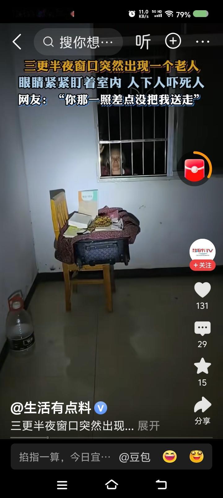 这视频是真的么?—— 据报道,三更半夜,某家窗户上出现一个老人的脸。主人手电照射