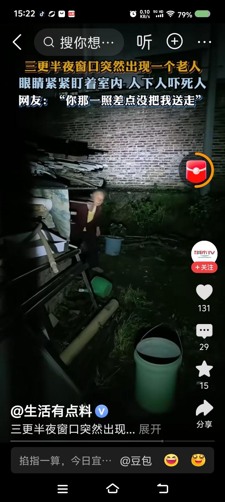 据报道,三更半夜,某家窗户上出现一个老人的脸。主人手电照射,老人马上离开,躲避,还回头看。