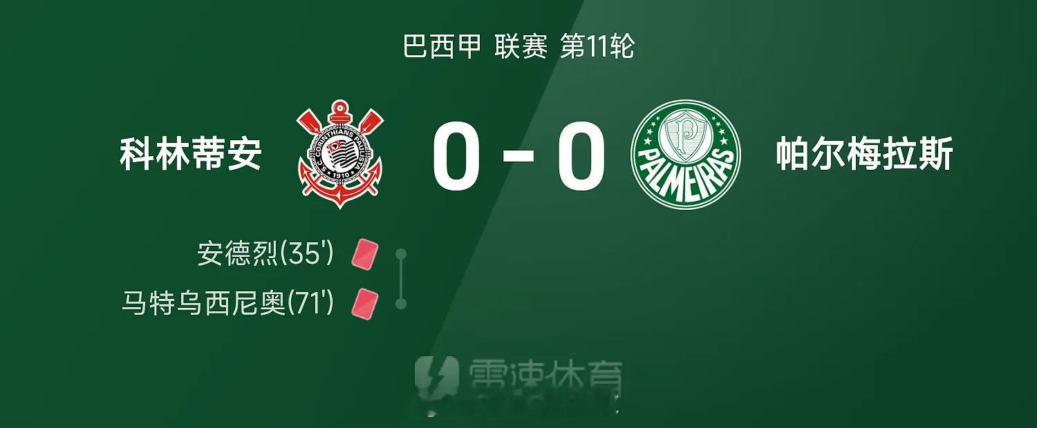 04月13日讯 26赛季巴西甲联赛第11轮,科林蒂安0-0互交白卷闷平帕尔梅拉斯。全场比赛,安德烈、马特乌西尼奥染红。足球体育明星西甲联赛足球