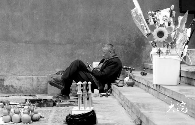 地摊没有顾客光临,这位老人看手机消磨时间。