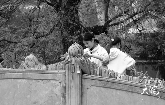 古城的热闹,多在午后,由外地游客带来。孔庙门口的小桥上,两名女孩留影后,好奇地翻看着游人挂在桥上的许愿牌,成了别人眼里的风景。