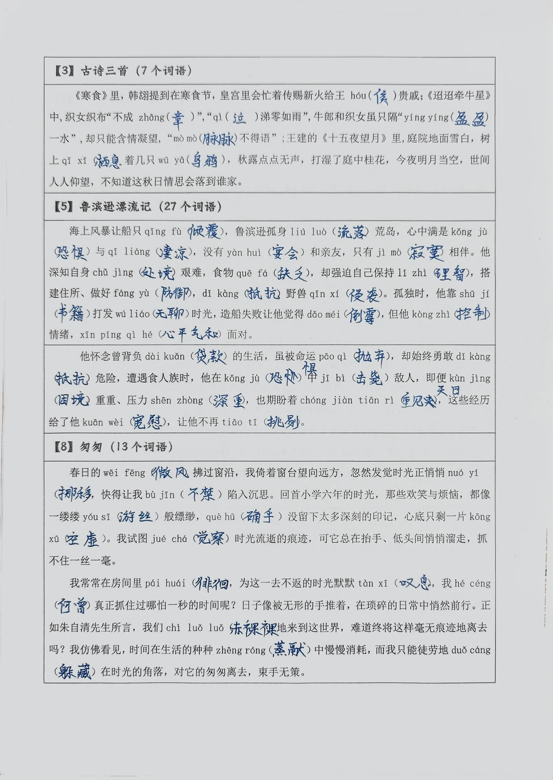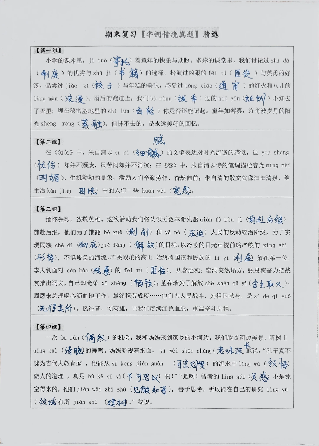 第四单元的易错生字较多,所以第一轮先口头听写,第二轮整理了【情境式】串联的看拼音写词语给孩子们默写,基础字词反复巩固。
