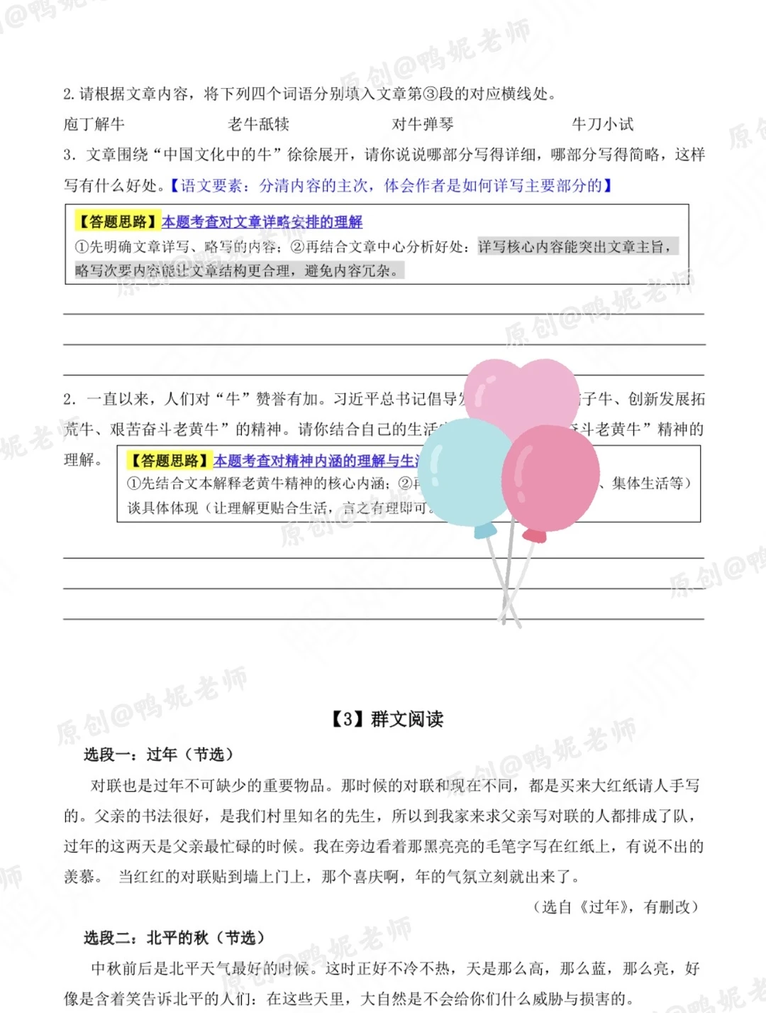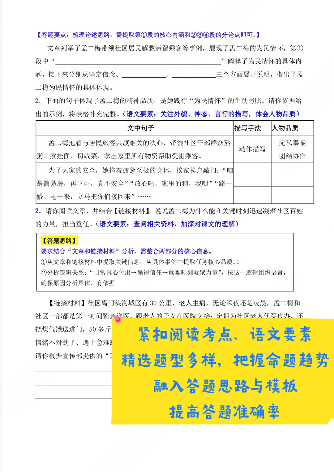对应找了相关阅读要素的四篇阅读训练题,把【答题思路】融入到了带有考点的题目中,训练学生有意识地运用正确的【答题模板】去分析题目,有条理地去做答。