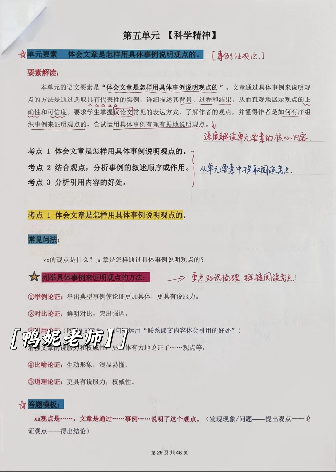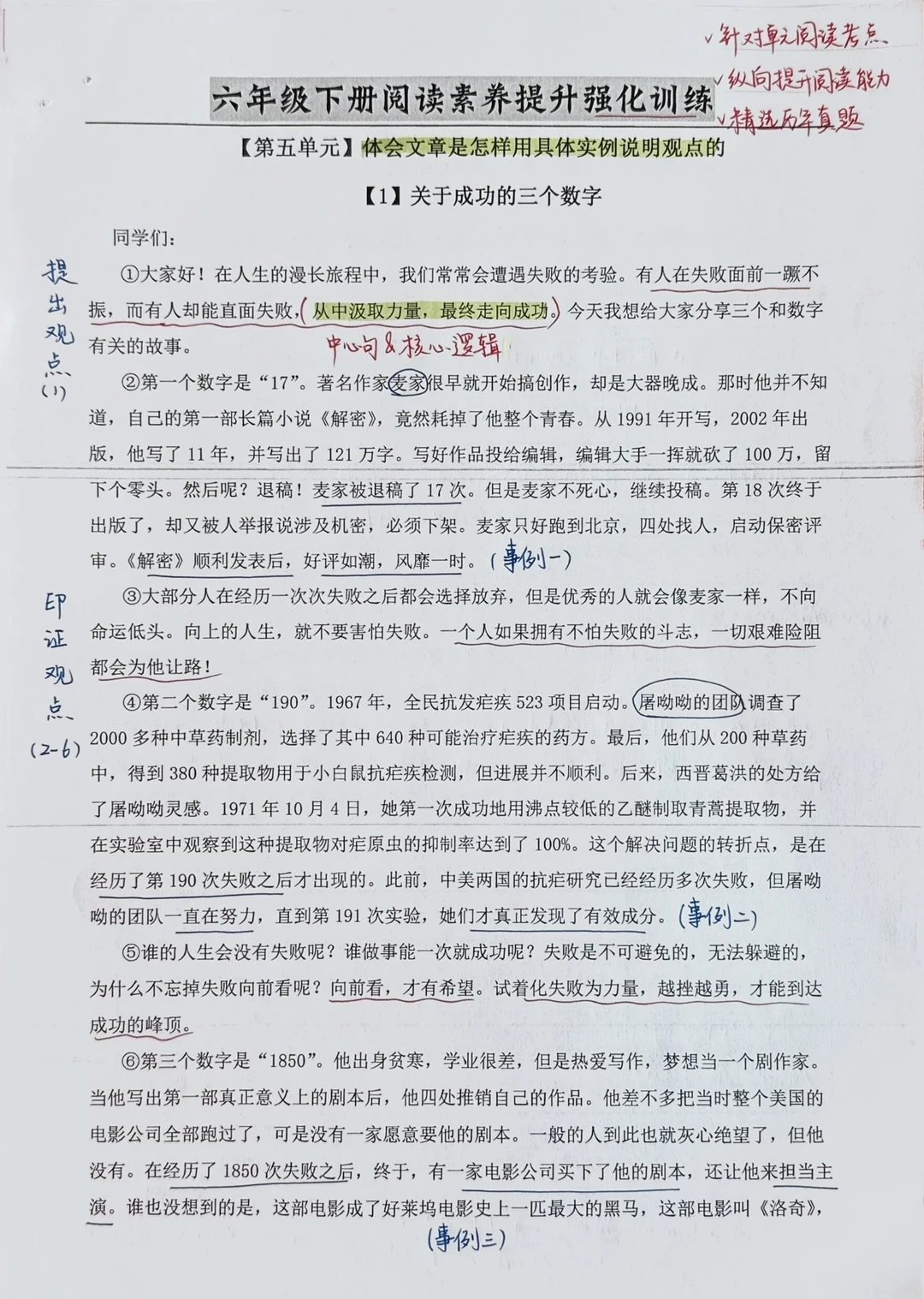 🔸单元要素:体会文章是怎样用具体事例说明观点的。