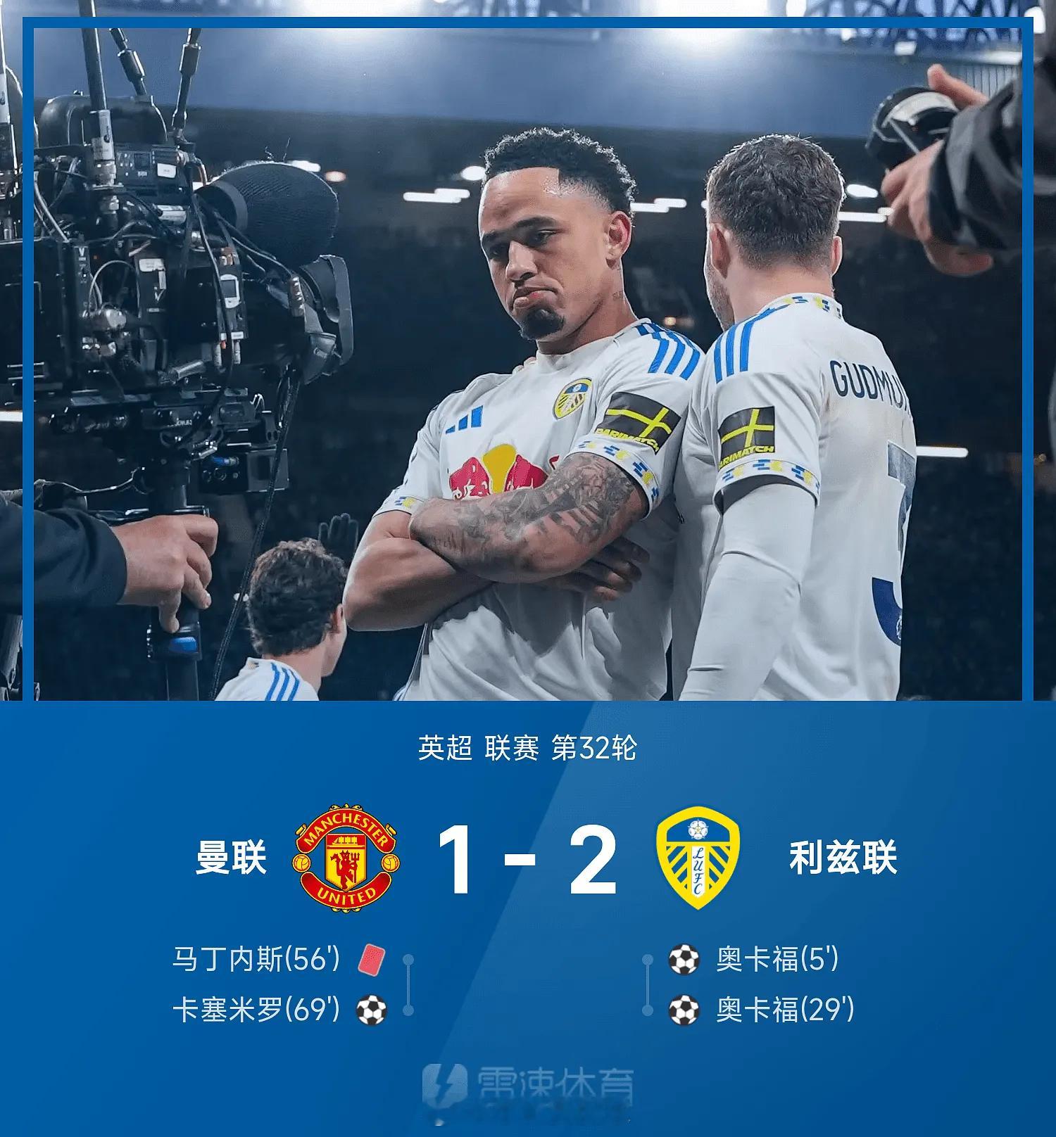 04月14日讯 25/26赛季英超联赛第32轮,主场作战的曼联1-2不敌利兹联。上半场,奥卡福在第5分钟和第29分钟连续破门帮助利兹联取得两球领先;易边再战,利马在第56分钟拉扯勒温头发吃到直红被罚下,第69分钟B费连线卡塞米罗破门,此后双方比分再未发生变化。利兹联时隔45年再度在客场击败曼联。足球英超体育明星英超联赛足球